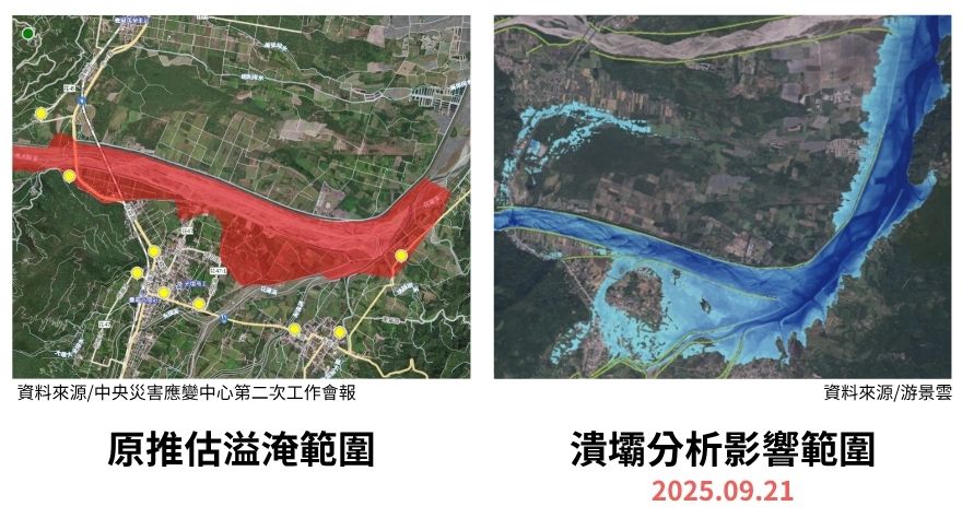 陽明交通大學防災與水環境研究中心主任林志平說明,研究團隊曾模擬過堰塞湖因颱風豪雨、地震潰壩,溢流口下切50公尺、100公尺等不同情境,而因為馬太鞍溪橋南岸堤防有缺口,因此大多模擬結果都顯示,潰壩後洪水主要會往南邊的光復市區溢流。