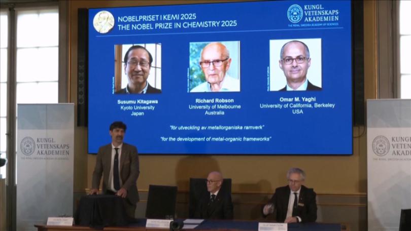 諾貝爾獎(Nobel Prize)台灣時間8日傍晚公布2025年化學獎得主,由日本京都大學教授北川進(Susumu Kitagawa)、澳洲墨爾本大學教授羅布森(Richard Robson),以及美國加州大學柏克萊分校教授雅吉(Omar Yaghi),因「在金屬有機骨架發展上的貢獻」而共同獲得該項殊榮。