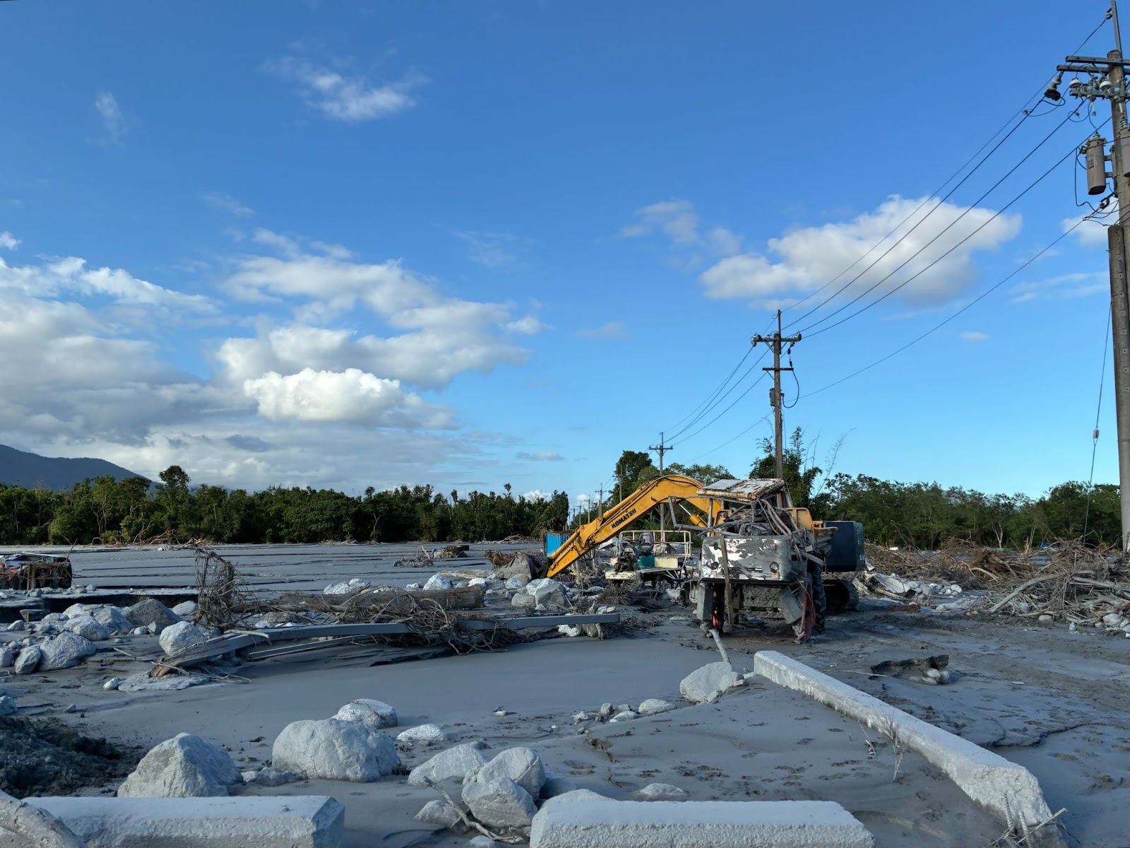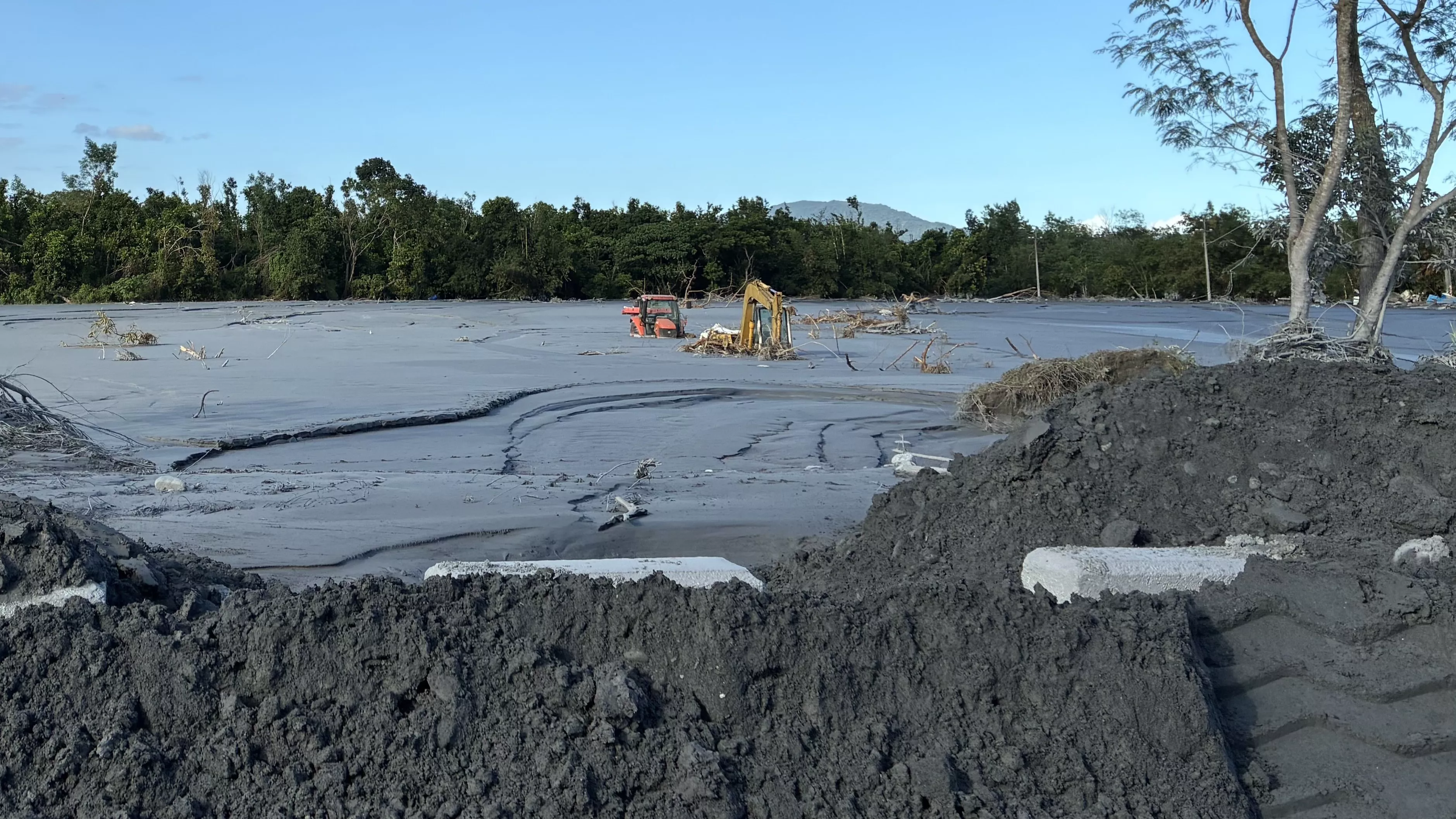 而在馬太鞍溪北岸較下游處的鳳林鎮,許多農地遭泥流淹過,收割機等農用機具也半掩在越過堤防的泥沙之中。