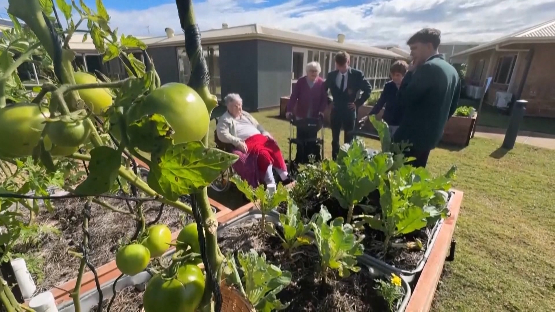 結實纍纍的番茄有綠有紅,旁邊還有不同的蔬菜,這是澳洲昆士蘭班達堡的一家長照機構的菜園,看著繽紛多彩的蔬菜,讓許多高齡住民笑開懷。
