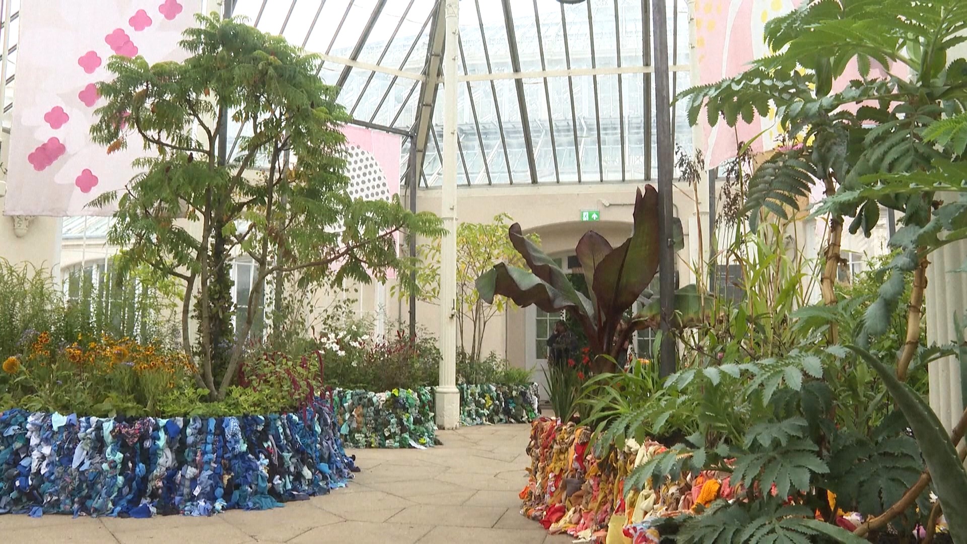 在邱園的溫室裡,花床上鋪滿廢棄衣料,布料多半來自慈善商店,象徵快時尚下的大量浪費;另一邊則展示以花草染出的布料傳達自然與衣物的連結,這項名為「全球威脅」的裝置藝術,與倫敦時裝週同步登場。