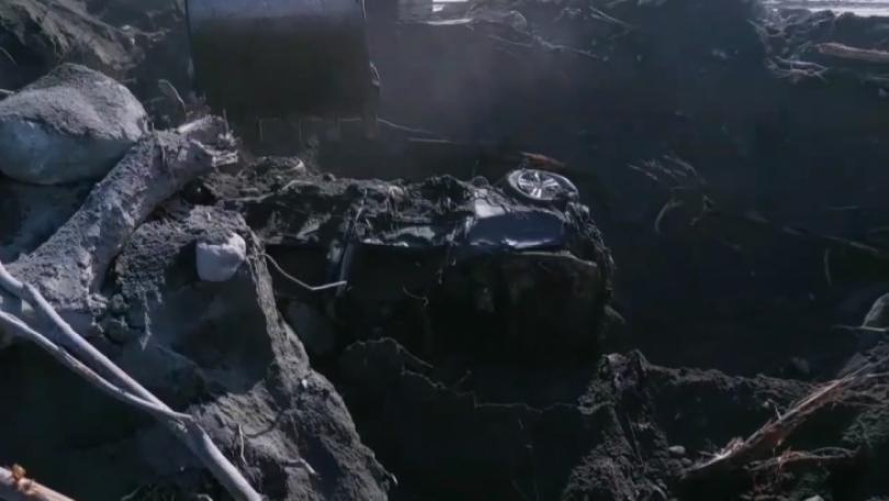 怪手13日持續在轎車周邊開挖,希望進一步找到夫妻倆,但車內未發現,消防署持續布署重機具執行搜尋任務。