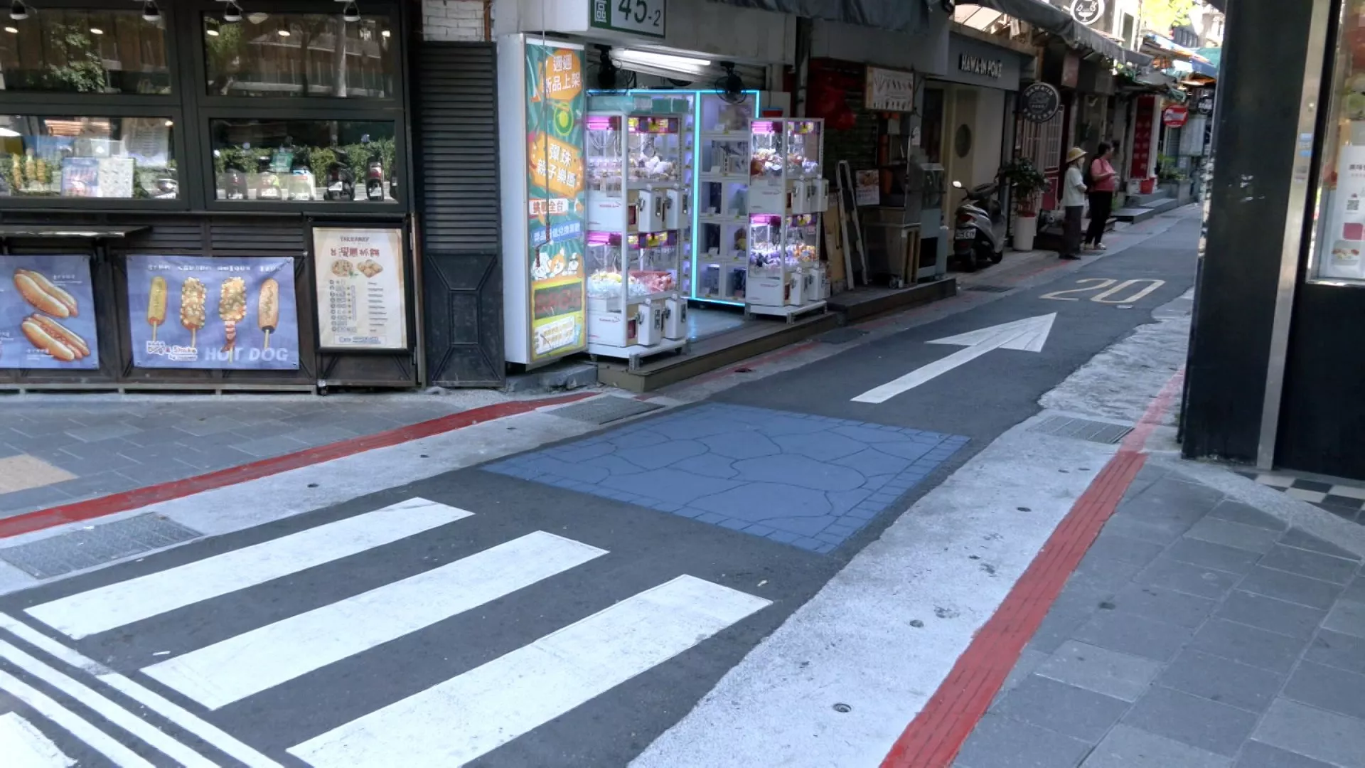 รถยนต์และมอเตอร์ไซค์ขับผ่านไปตามท้องถนน แต่เมื่อสังเกตดีๆ ก่อนเลี้ยวเข้าซอย บนพื้นถนนจะระบายสีที่ต่างออกไป มีทั้งสีน้ำเงินหรือสีม่วง กองจราจรไทเปบอกว่า เพื่อเตือนผู้ขับขี่ว่า กำลังขับเข้าสู่เขต "มิตรคนข้าม" แล้ว ต้องจำกัดความเร็วไม่เกิน 30 กม./ชม. และห้ามบีบแตร หากฝ่าฝืน ปรับไม่เกิน 3.6 หมื่นเหรียญไต้หวัน