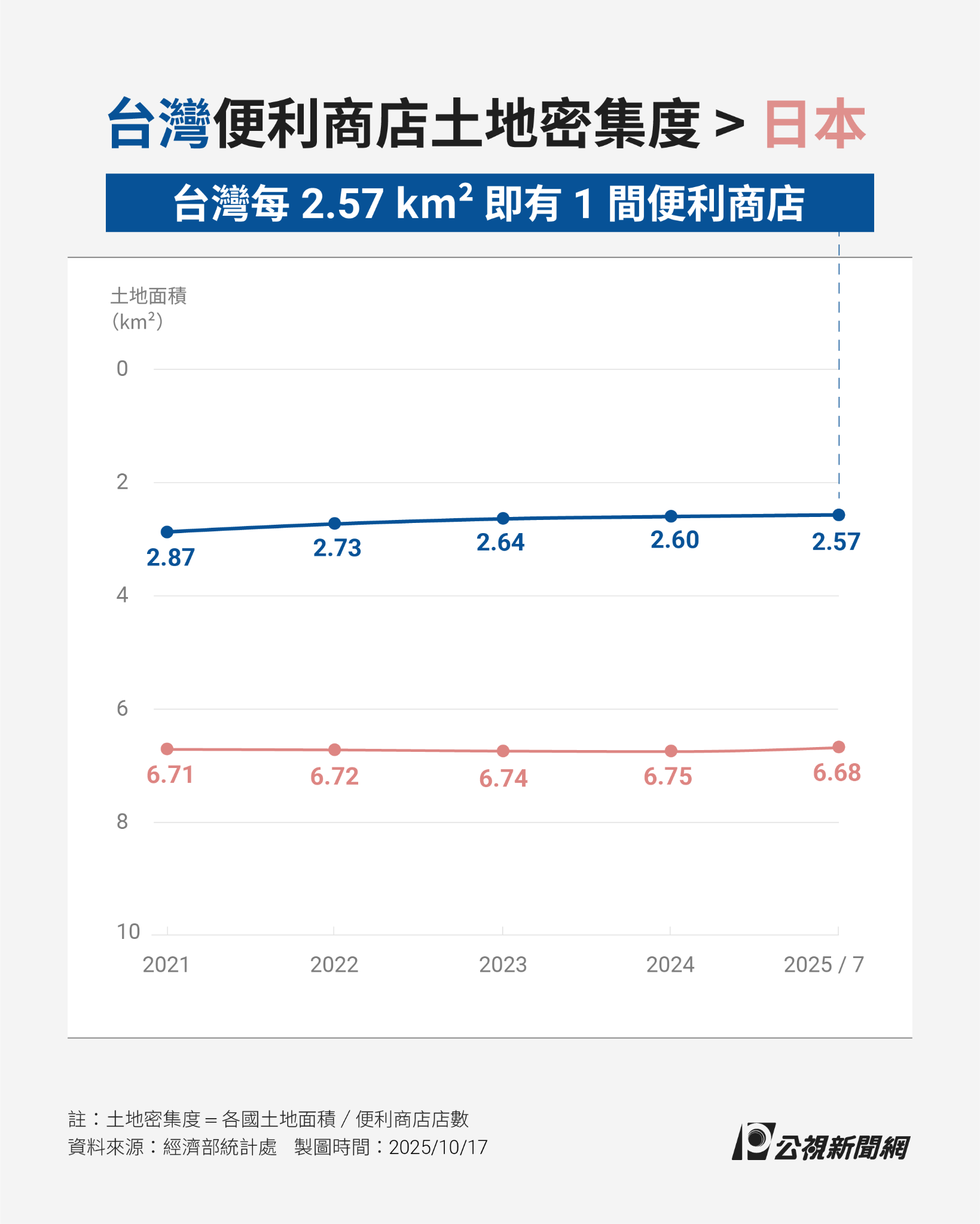 統計指出,若以土地面積計算,台灣平均2.57平方公里即有1間便利商店,相較日本每6.68平方公里出現1間,台灣便利商店土地密集度明顯高過日本,且近5年持續上升。換作人口密集度計算,今年7月我國平均每1659人即擁有1間便利商店,日本則平均每2180人擁有1間。
