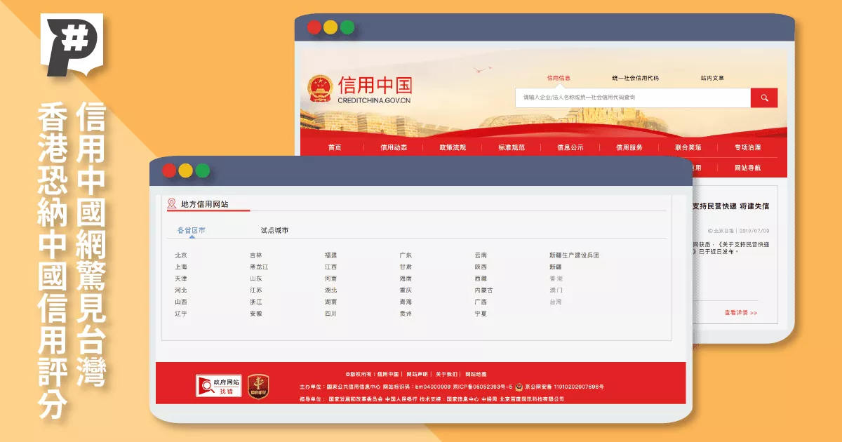中國信用評分恐納香港 「信用中國」官網驚見台灣