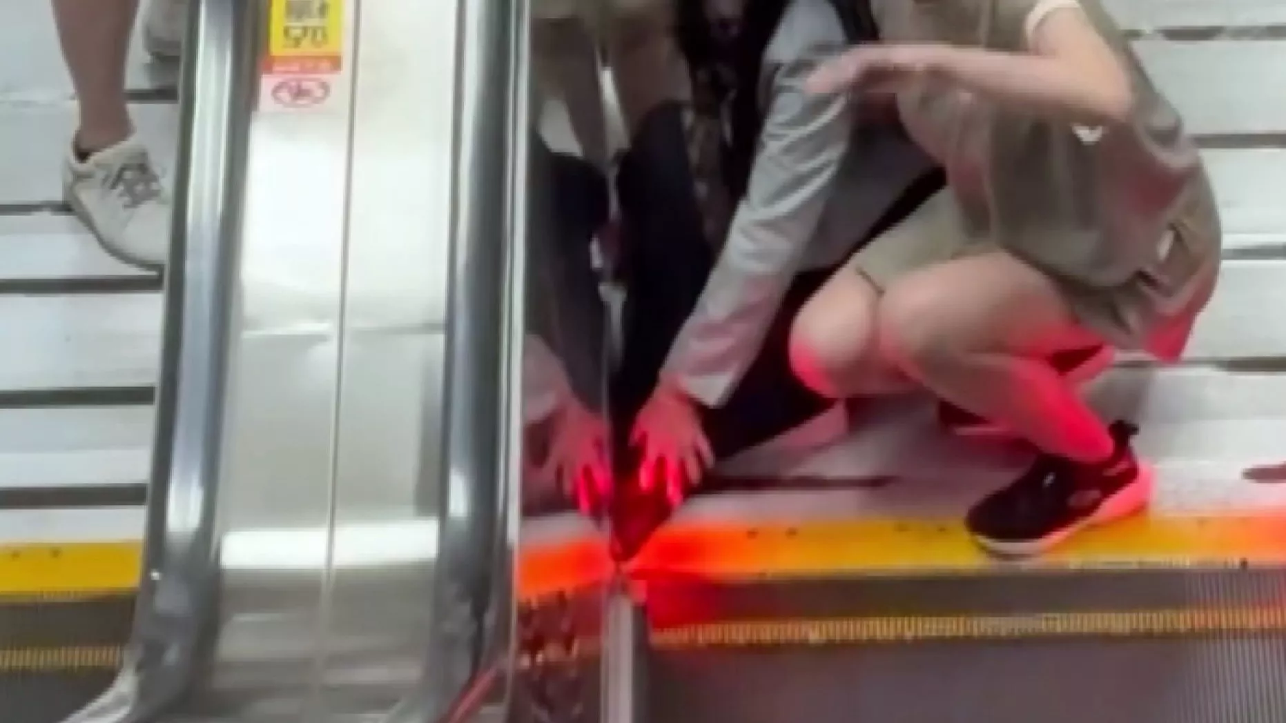 Một cô gái tóc dài ngồi xổm trên thang cuốn, bên cạnh có người vẫy tay ra hiệu, thì ra tà váy của cô ấy bị cuốn vào thang cuốn. Vụ việc xảy ra tại ga xe điện metro Jiang-zicui, cũng may có người nhiệt tình đã ngay lập tức nhấn chuông khẩn cấp, thang cuốn tạm dừng hoạt động, trưởng ga cũng đã có mặt kịp thời để xử lý, hỗ trợ hành khách thoát khỏi tình huống nguy hiểm.