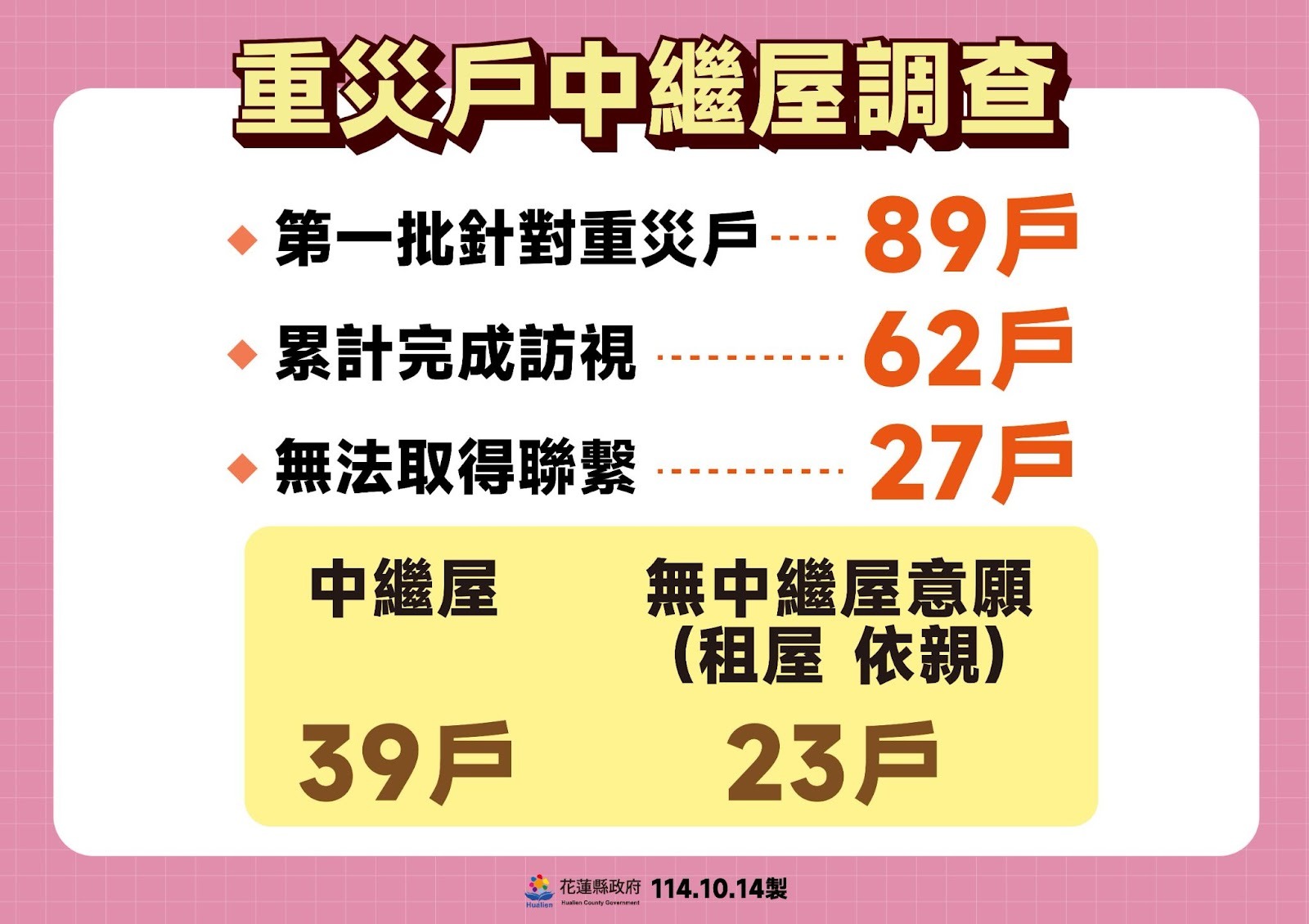 至於中繼宅,賴宛秀表示,當時災後依居民需求規畫共2處中繼宅,今年9月皆已完工,分別是慈濟基金會自2024年9月興建的「大愛屋」5層樓集合式住宅,大愛屋雖名為中繼永久屋,不過供受災戶暫時居住,待住戶搬回住處後,將由縣府轉做社宅使用;另外則是與紅十字會在花蓮市美崙地區建造、於2025年5月動土的中繼安置組合屋。