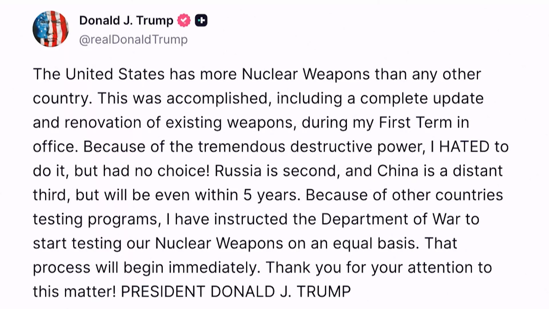川習會展開前,美國總統川普(Donald Trump)突然在社群媒體上宣布,已下令戰爭部立刻重啟核試。紐約時報報導指出,川普選在這個時間點做此宣示格外詭異,如果付諸執行,將是美國33年來首次進行核試。而川普在川習會後搭機返美時表示,由於其他國家也在進行核試驗,美國進行核試有其必要,具體核試地點將在稍後決定。