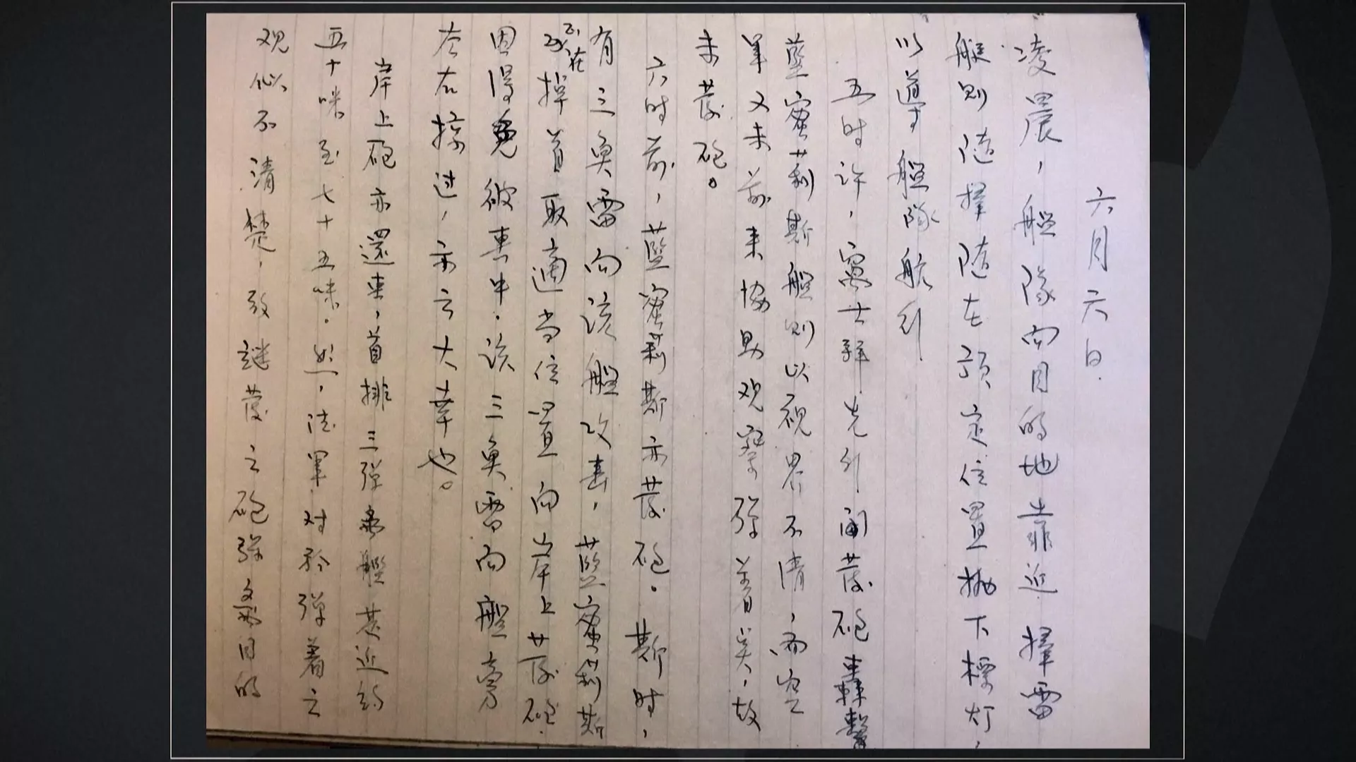 二戰華人日記策展人安格斯許說明,「林炳堯曾是中華民國海軍軍官,參與了1944年的諾曼地登陸。1943年,他被中國政府選拔到英國國家海軍受訓,隨後又參與解放法國的戰爭。這本日記有80頁1萬3000字,主要記錄1944年5月到11月期間。」