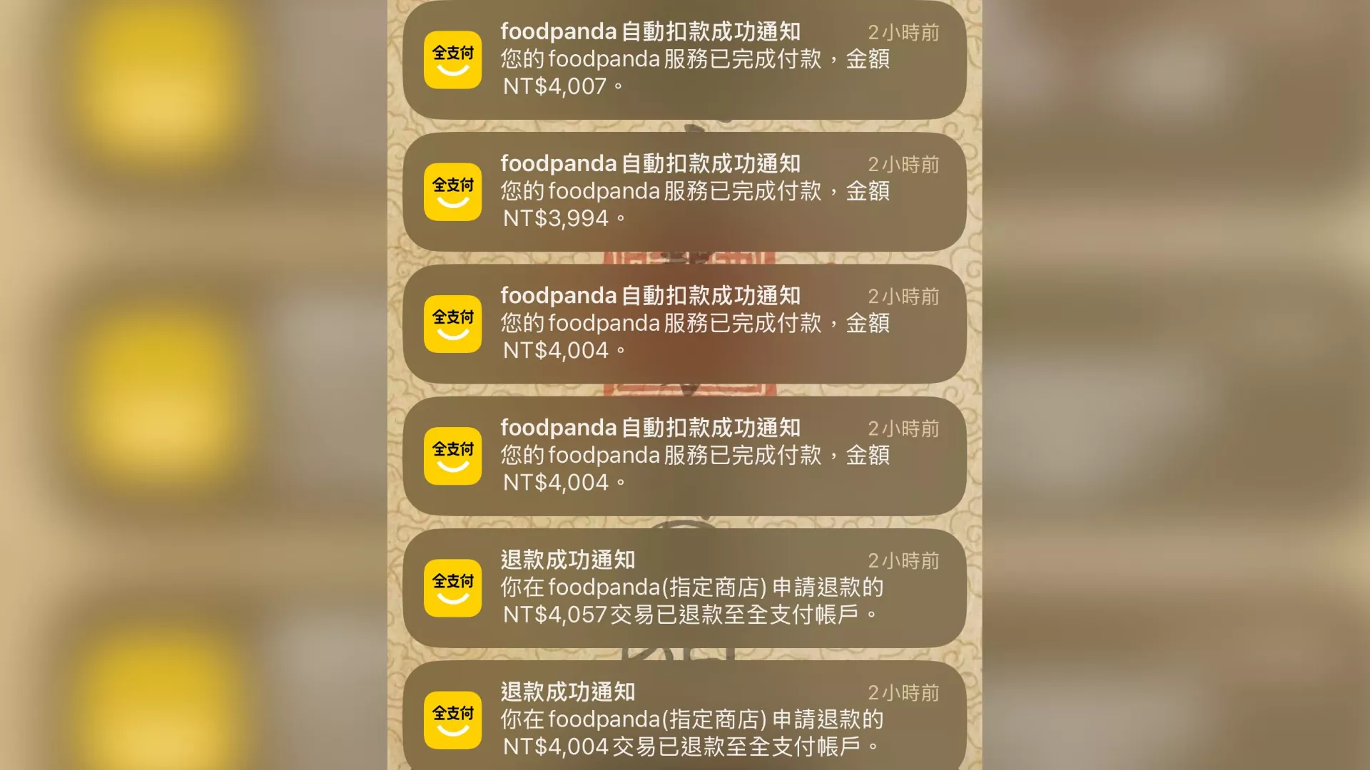 有民眾昨(4)日在社群發文指出,自己在外送平台foodpanda上授權使用全支付付款,並綁定以玉山銀行網路帳戶扣款,3日晚間手機卻一連跳出20幾筆foodpanda全支付扣款通知,總金額超過新台幣8萬元。