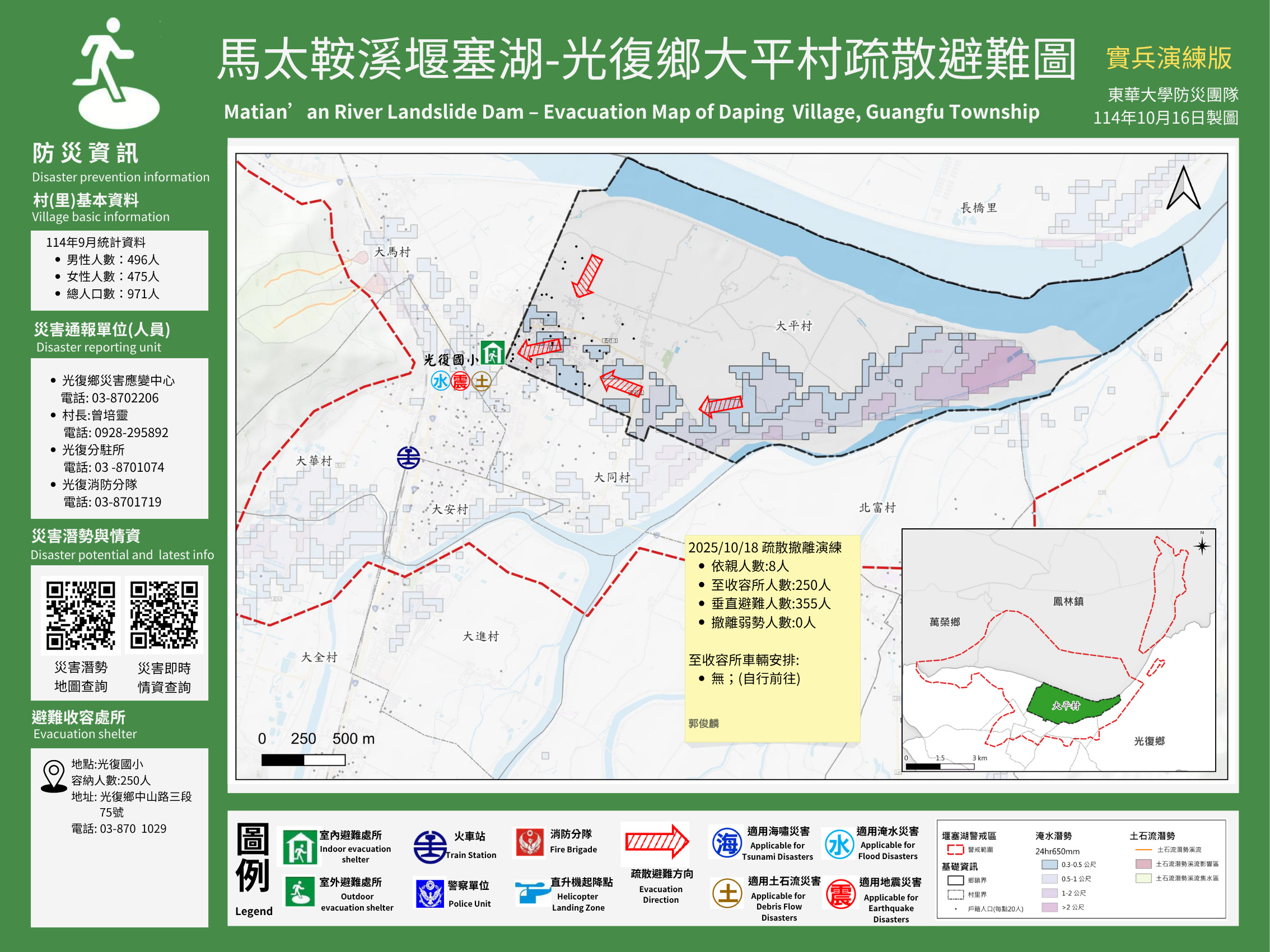 消防署推出「強韌台灣計畫」,其中,東華大學是花蓮防災協作單位之一。東華大學臺灣文化學系副教授郭俊麟,專長之一是地圖與文化研究。翻開光復鄉的避難疏散地圖,他指出,標題並沒有說明是針對哪種災害的避難疏散;再者,村里的行政範圍不明,「總之,大家避難就是朝某一個方向或者某個收容所來避難」。