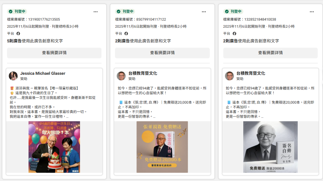 民眾若在Meta廣告資料庫中輸入關鍵字,也可發現仍有許多詐騙廣告存在,手法包含假冒名人、假借贈書名義等。