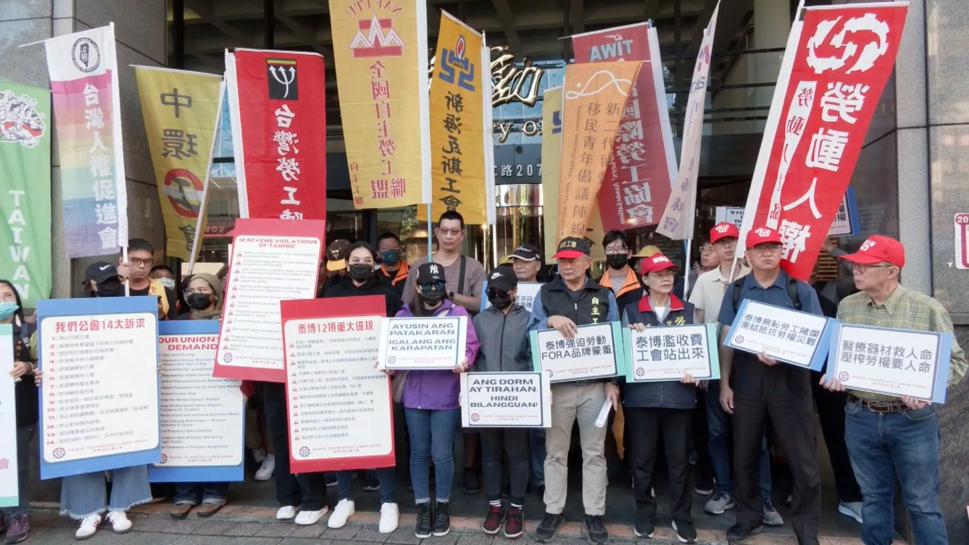 Sáng nay ngày 7/11, một nhóm lao động Philippines và các tổ chức hỗ trợ đã tập trung trước Bộ Lao động Đài Loan để lên tiếng về điều kiện làm việc tại công ty TaiDoc Technology. Họ cáo buộc công ty này đã đưa ra các quy định vô lý, như buộc lao động phải tải ảnh để điểm danh ngay cả khi đang ở ký túc xá, ai vi phạm sẽ bị trừng phạt.