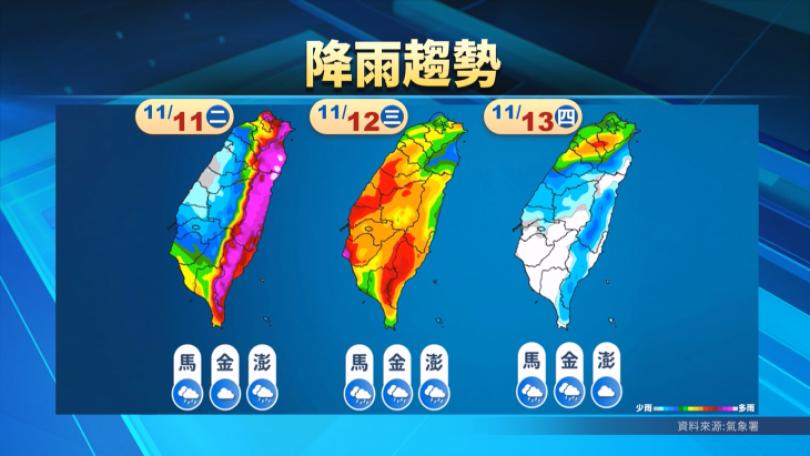 週二受到東北季風和颱風外圍環流雙重影響,降雨範圍會從大台北以東,延伸整個東半部以及恆春半島;週三12日,颱風更接近,隨中心登陸,降雨熱區會在花東和中南部;13日起,可能已減弱成熱帶性低氣壓,雨區會在中部以北,但強度明顯趨緩。