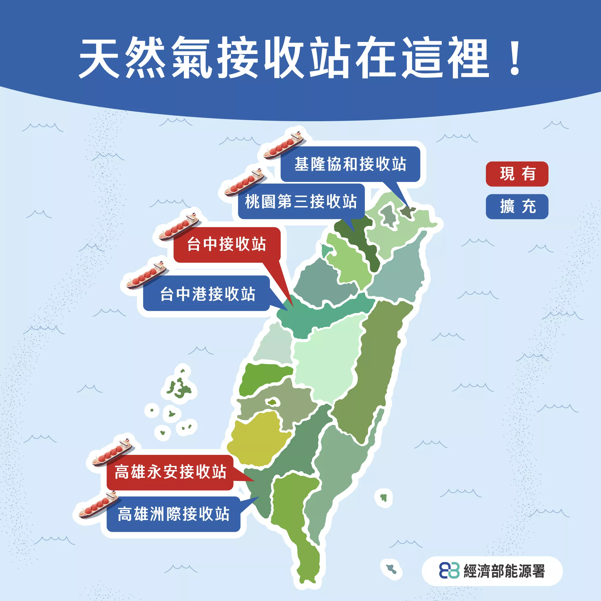 經濟部能源署日前指出,台灣目前共有高雄永安、台中2座天然氣接收站。為滿足用氣需求,同時減少燃煤碳排、推進能源轉型,未來將增設4座接收站,分別為基隆協和、桃園第三、台中港及高雄洲際接受站。