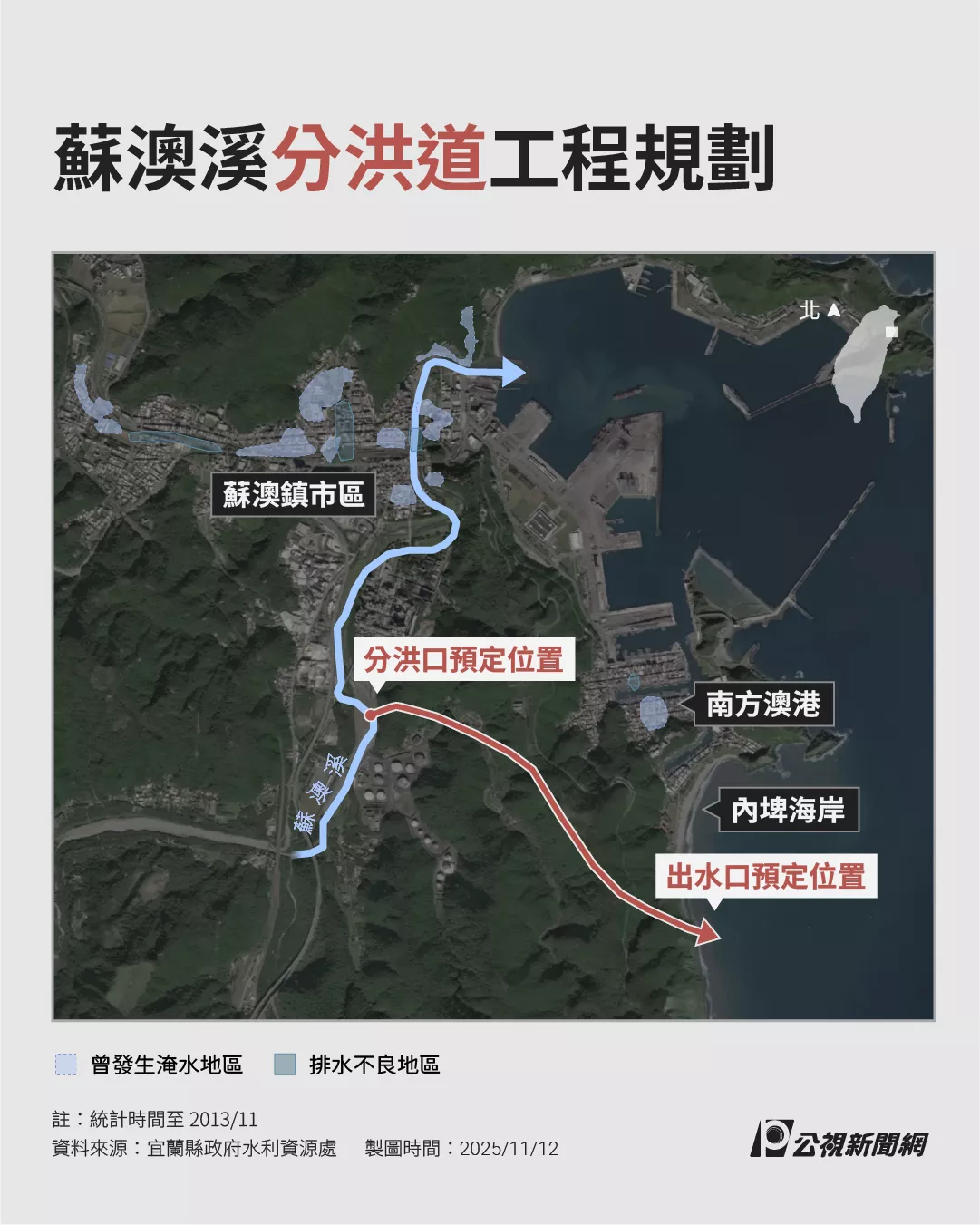 然而,蘇澳溪分洪道原本預計明(2026)年完工,過程中因Covid疫情後原物料價格上漲,宜蘭縣政府評估將工程經費提高至75億元,預計竣工期程也延至2028年底。今年初將新版計畫送交行政院審查,但分尚未核定,也未動工。