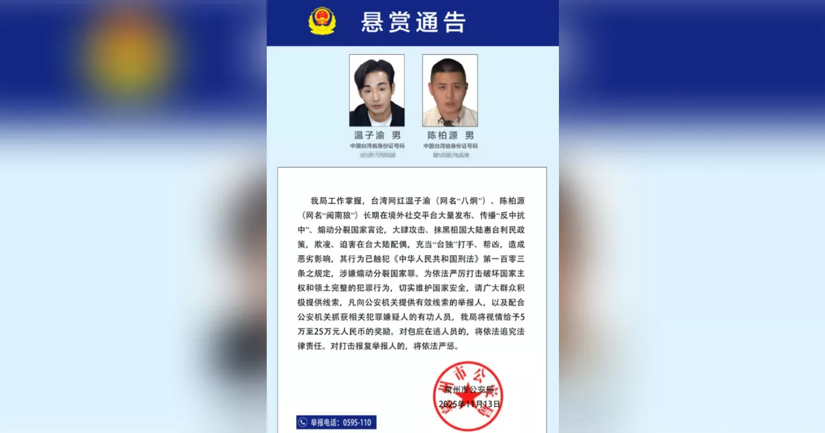中國福建省泉州市公安局13日對台灣網紅八炯、閩南狼發布懸賞通告,並公開兩人本名、身分證字號等個資。