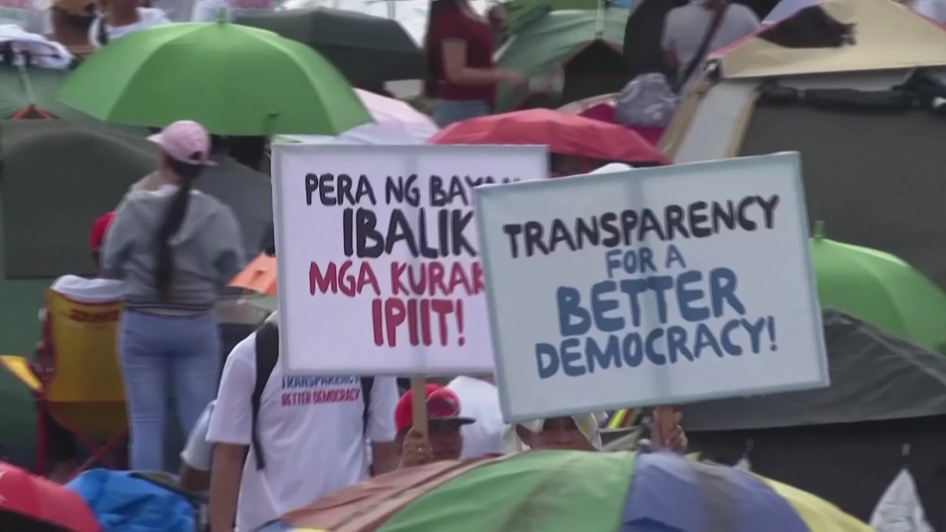 示威者高舉的這塊標語寫著「把百姓的錢還來、把貪污的人關起來」、「要先透明,才有真正的民主」。在影響力龐大的基督堂教會號召下,示威群眾在首都馬尼拉集結。黎薩公園現場湧進約數10萬人,另有包括退休將領在內約2千人在大馬尼拉地區奎松市人民力量革命紀念碑前,舉行另一場反貪腐示威。