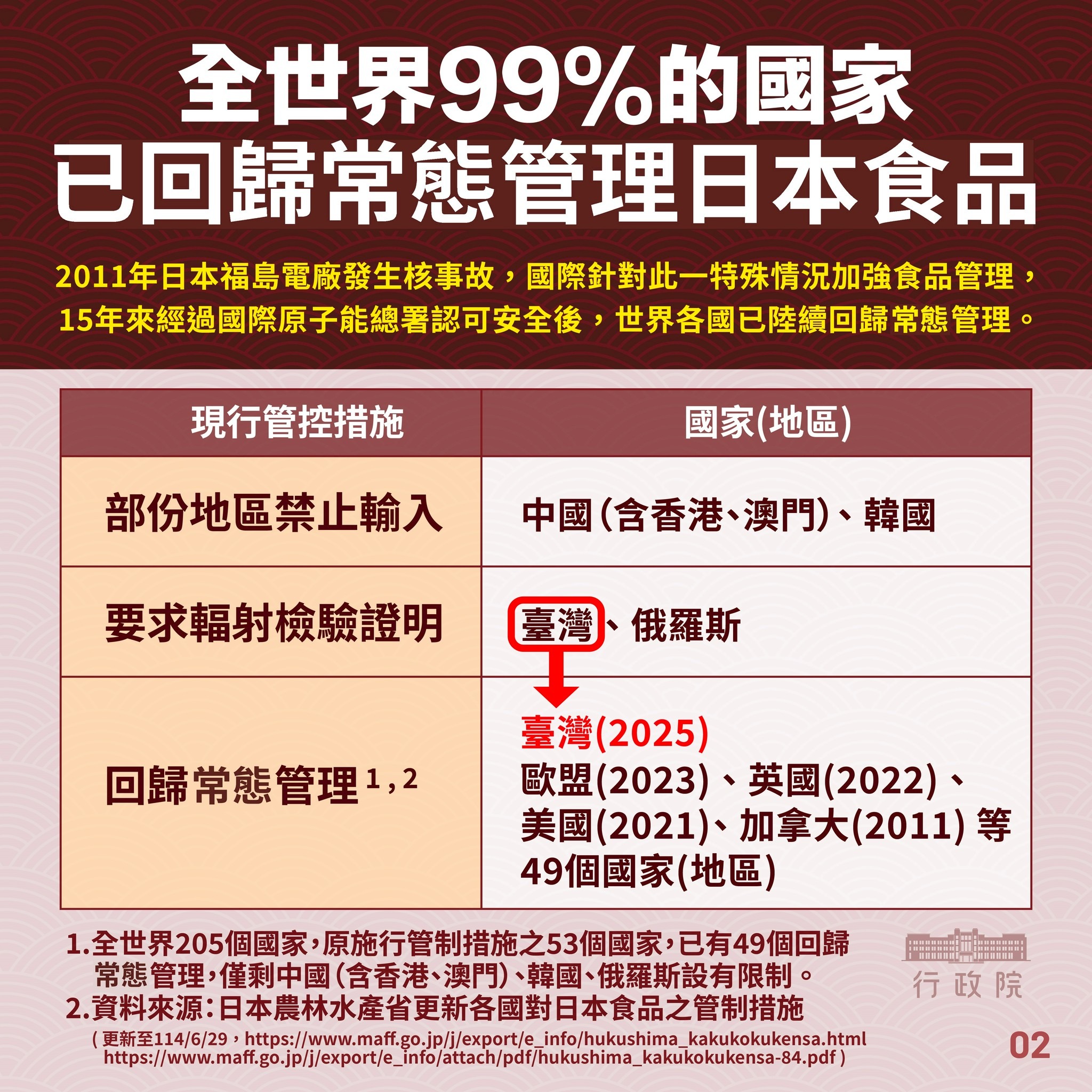 依據科學數據,台灣對日本食品風險評估的額外輻射暴露風險為「可忽略」;另外,根據國際原子能總署(IAEA)資訊顯示,日本政府已採取妥適的監測及因應措施,並依監測結果滾動式更新其國內之食品管制,有效管控食品供應鏈之安全性。因此,食藥署研議日本食品回歸源頭管理與邊境管制,且預告期間未接獲反對意見,因此調整為與其他國家食品管理一致,以風險分級為基礎的抽驗機制把關。