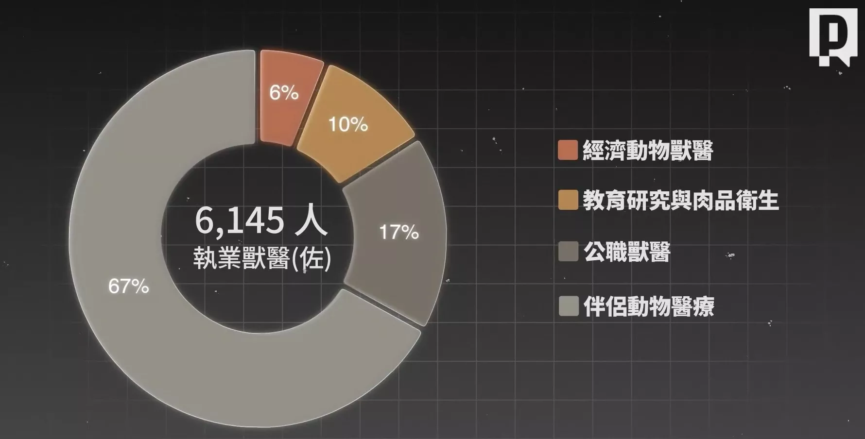 在酬勞低的環境下,台灣投入經濟動物的獸醫師只有6%,負責防疫的公職獸醫師則占17%,絕大部分67%獸醫師選擇伴侶動物醫療。