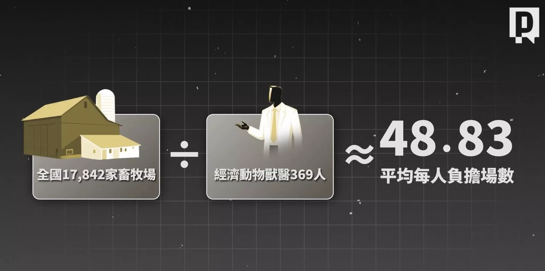 目前全國共有1.7萬家畜牧場,雖然畜牧場簽訂特約獸醫師不一定要是畜牧場專業,但大多還是會以經濟動物獸醫師為主,若換算下來每人平均要分攤將近50場。