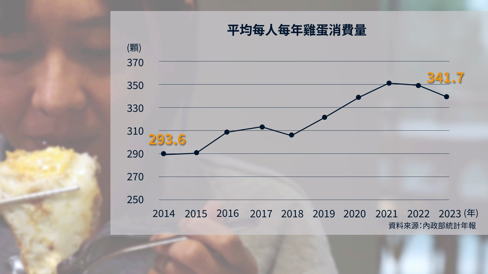 台灣平均每人每年雞蛋消費量,從2014年的293.6顆持續成長到2023年的341.7顆;國內雞蛋生產量也從一年68.8億顆,上升到80億顆,面對越來越大量的雞蛋需求,國內雞蛋食安如何確實把關?尤其從2017年至今,芬普尼雞蛋仍無法完全杜絕,蛋雞產業生產端的輔導改善,還須要加強力道。