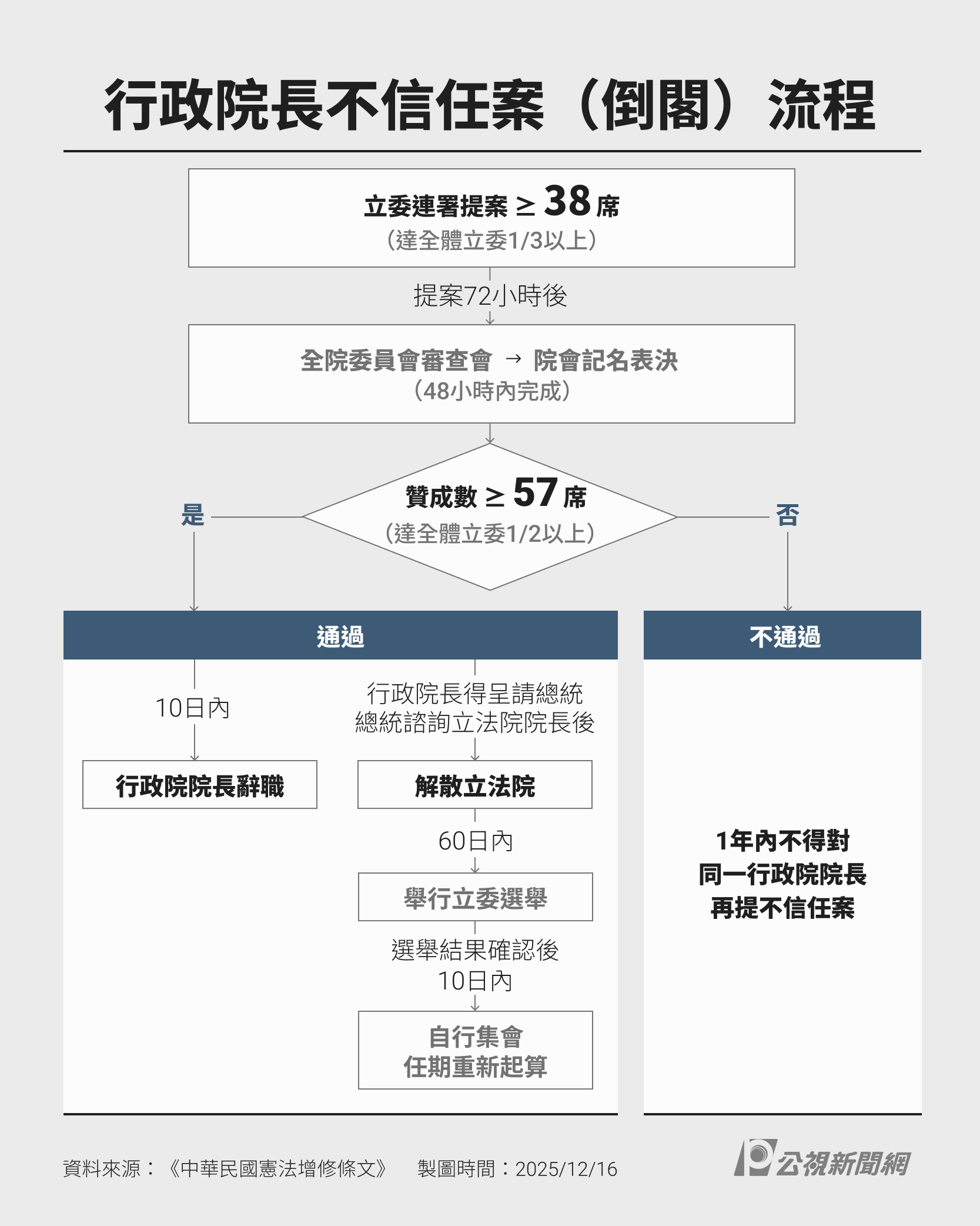 根據《中華民國憲法增修條文》與《立法院職權行使法》規定,行政院長不信任案須由立法院全體三分之一以上立委連署提出,並於提出後72小時後召開審查會,且需在48小時內完成記名投票表決。