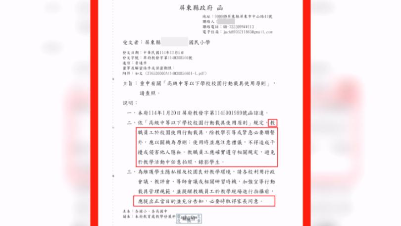 就是這份公文,屏東縣政府發函予屏東縣內,200外間高中以下學校,公文內容寫著,教職員工佇校園使用行動載具,除了教學引導和緊急連絡以外,攏以關手機仔為原則。甚至閣講若欲使用手機仔翕相錄影,愛先經過學生家長同意。聽著這種要求,學生家長攏感覺無合理。