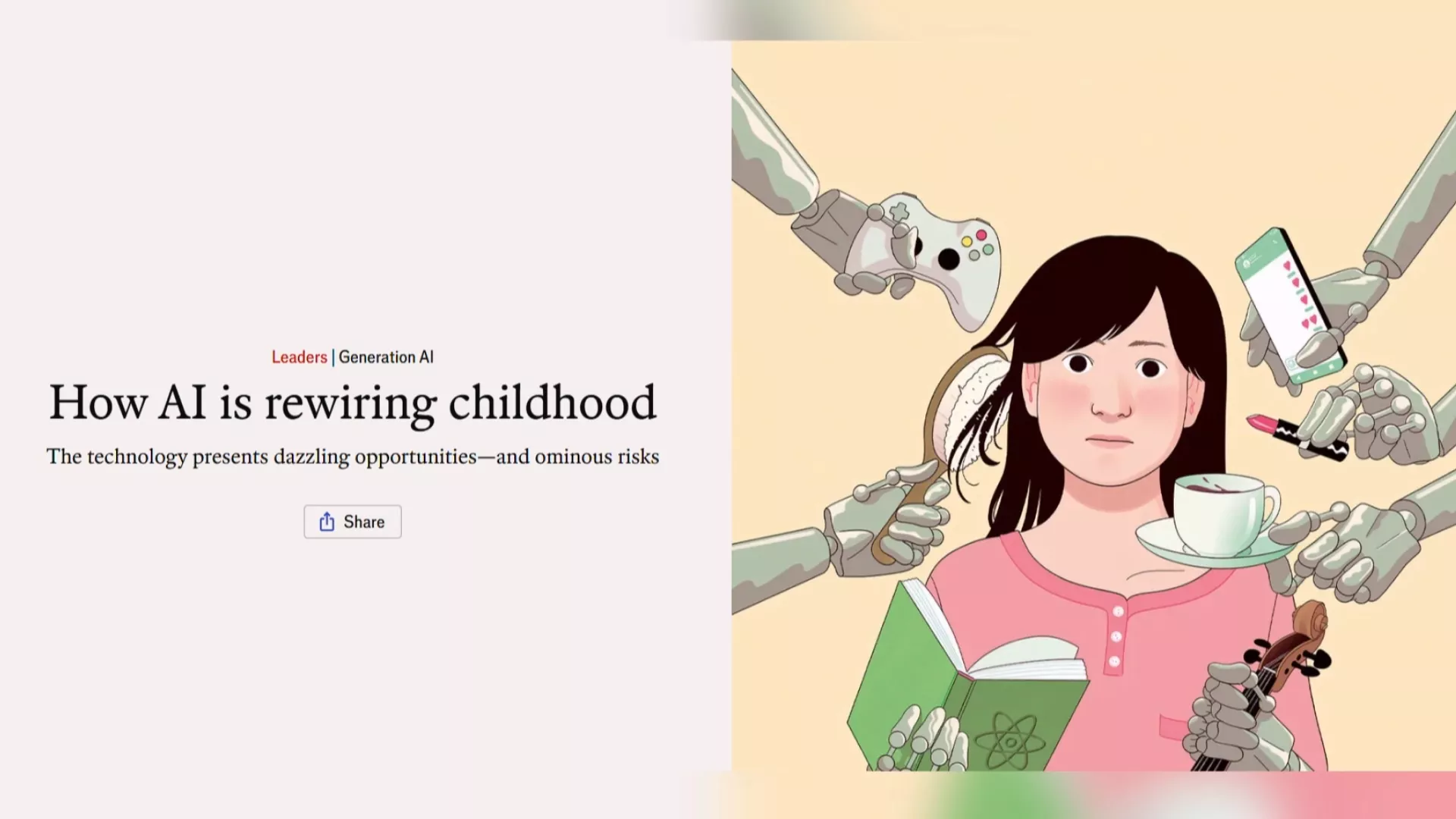 《經濟學人》便以「AI正重塑童年」為主題,探討生成內容、演算法和即時回饋,如何影響孩子建構童年與自我思維。