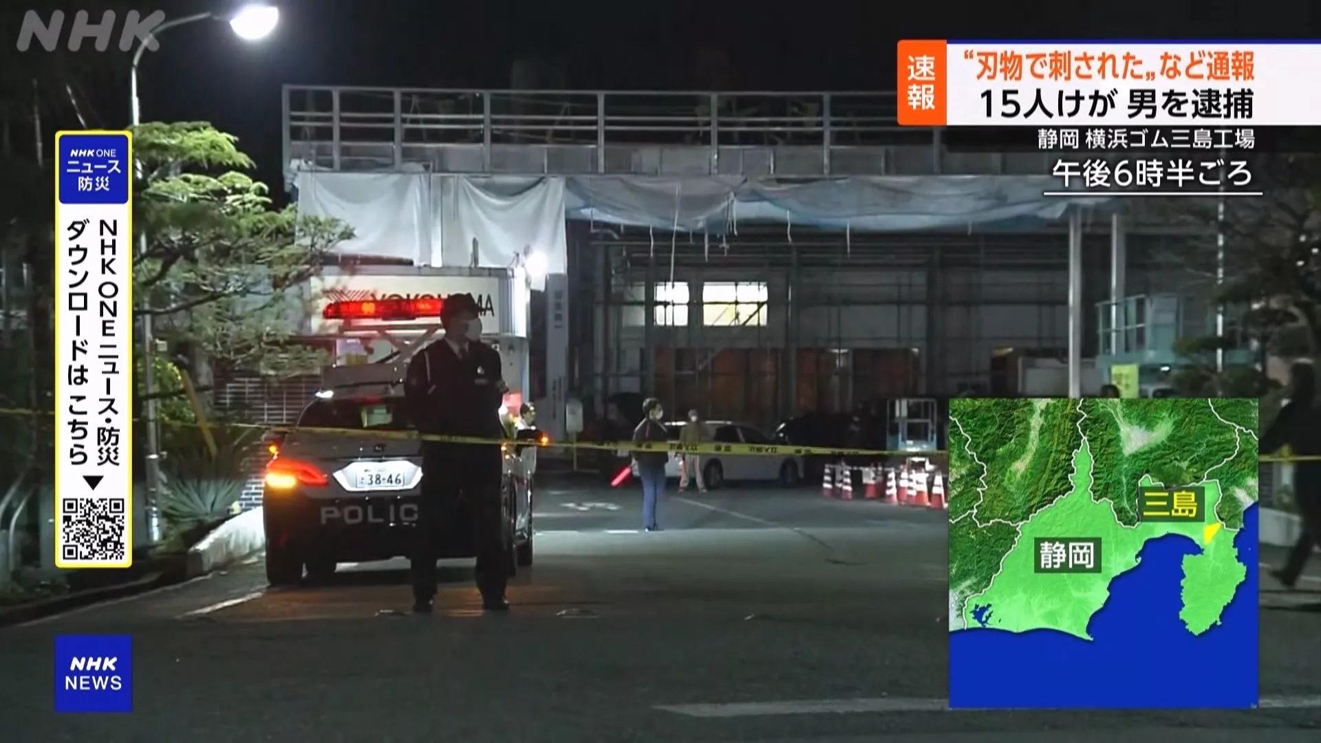 今(26)日下午4時半左右,靜岡縣三島市的橫濱橡膠三島工廠,一名身份不明的男子襲擊多名員工,造成15人受傷,其中8人被刀刺傷,6人疑似被噴灑液體,5人傷勢較為嚴重,但全都意識清醒。
