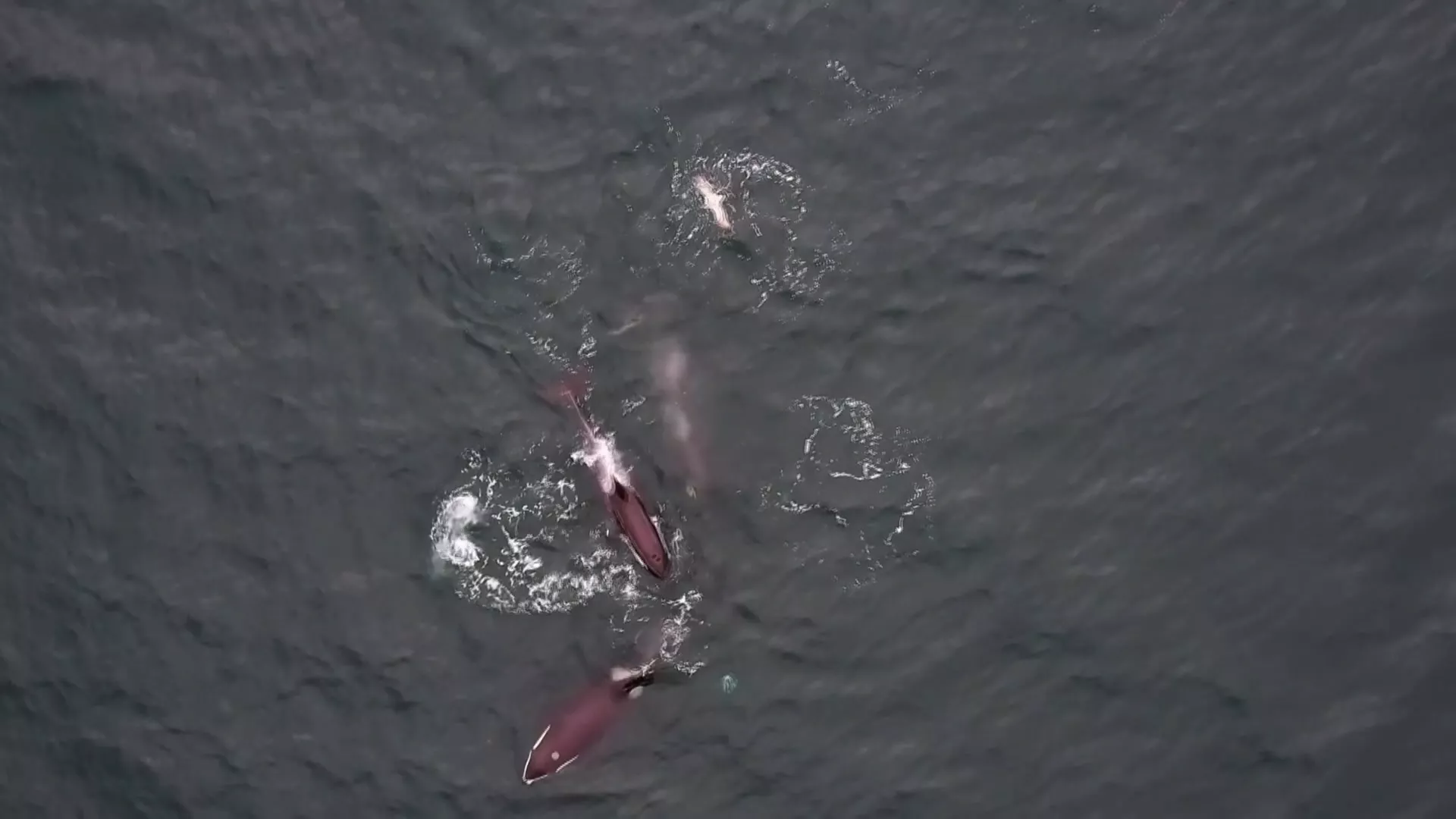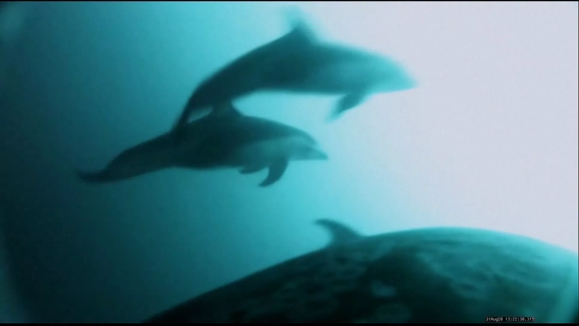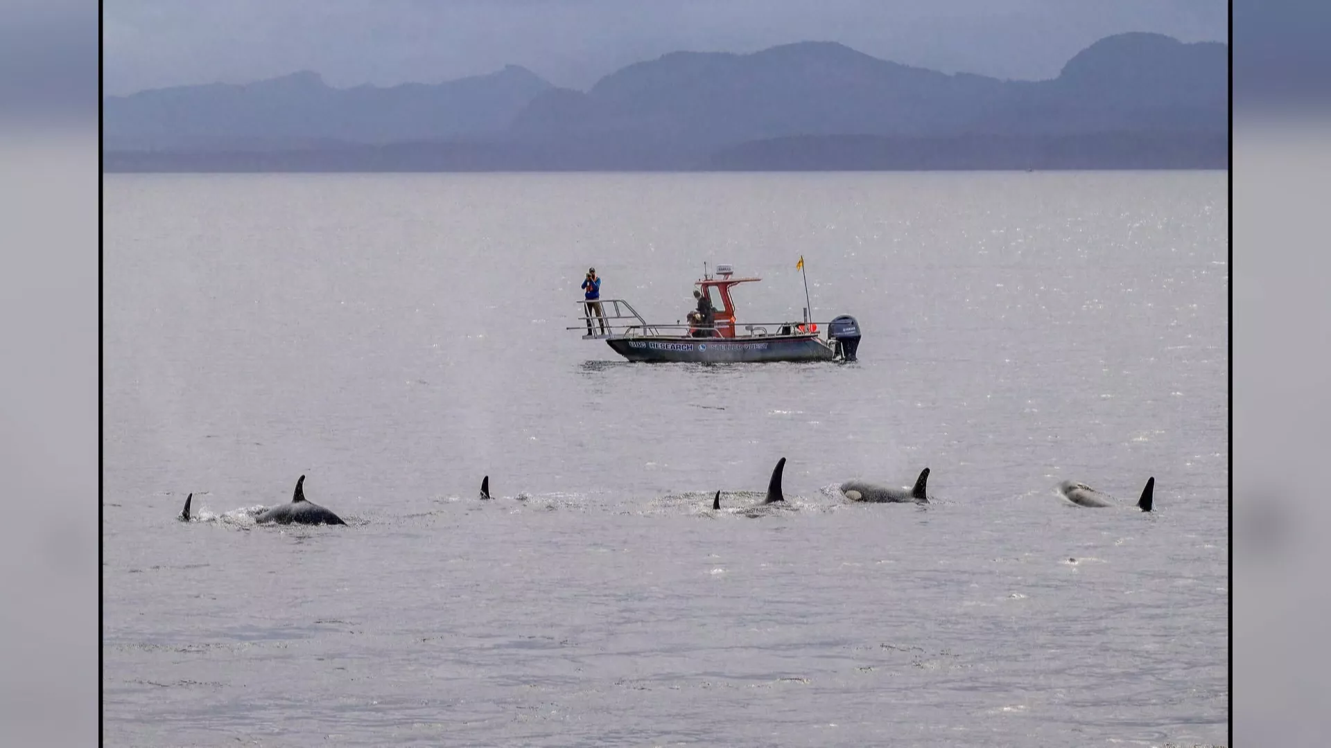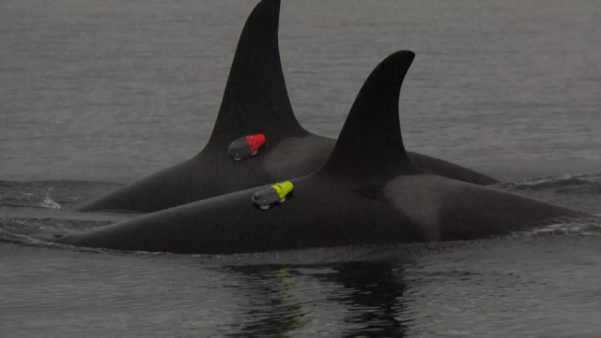 裝設在虎鯨身上的攝影機,清楚拍下前方有海豚游動,隨後能看到至少2到3隻虎鯨正在圍獵一隻鮭魚,旁邊還有海豚圍繞。
