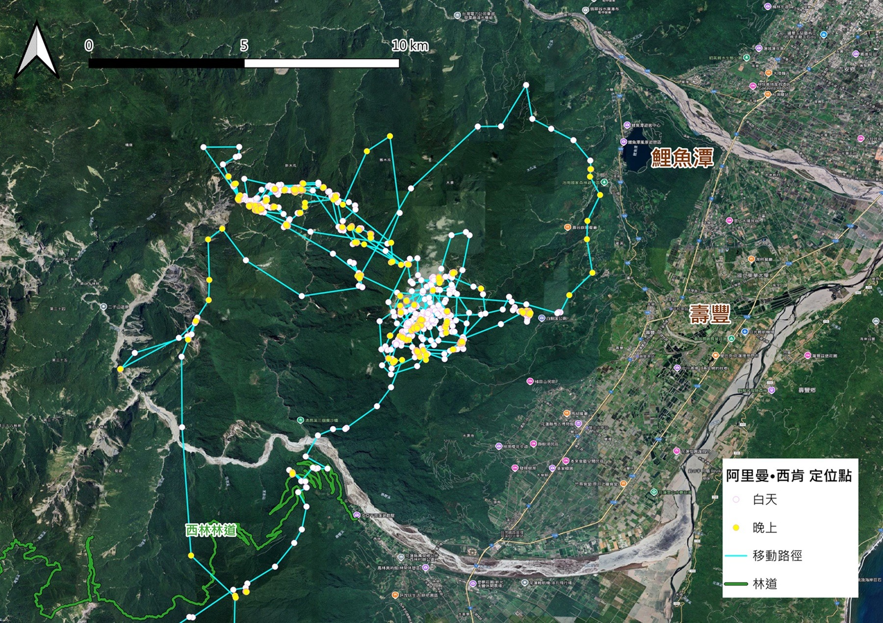 根據阿里曼配戴的追蹤裝置紀錄,牠在野放後曾長距離往北移動至直線距離達64公里處,在當地停留活動一段時間之後,又再度往南折返回到距野放地東側不遠之聚落,是目前已知台灣黑熊活動範圍面積最大的個體紀錄。