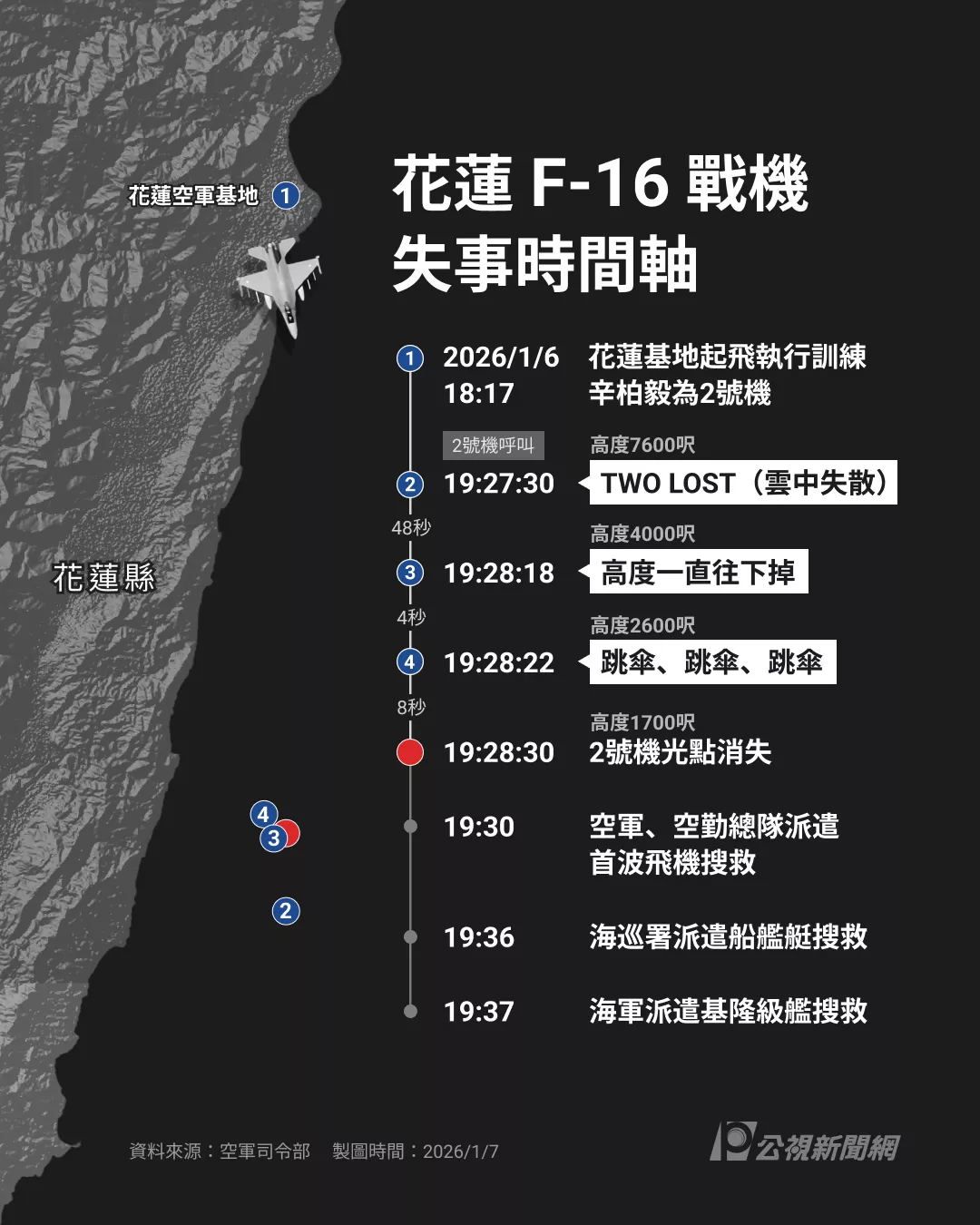 飛官辛柏毅於6日晚間6時許,駕駛機號6700的F-16單座戰機從花蓮空軍基地起飛,原定進行夜間例行性訓練,但在起飛約1小時後,辛柏毅發出跳傘呼叫並失聯,空軍隨即成立應變中心展開搜尋行動,海巡署與國搜中心也派出艦艇搜索救援。