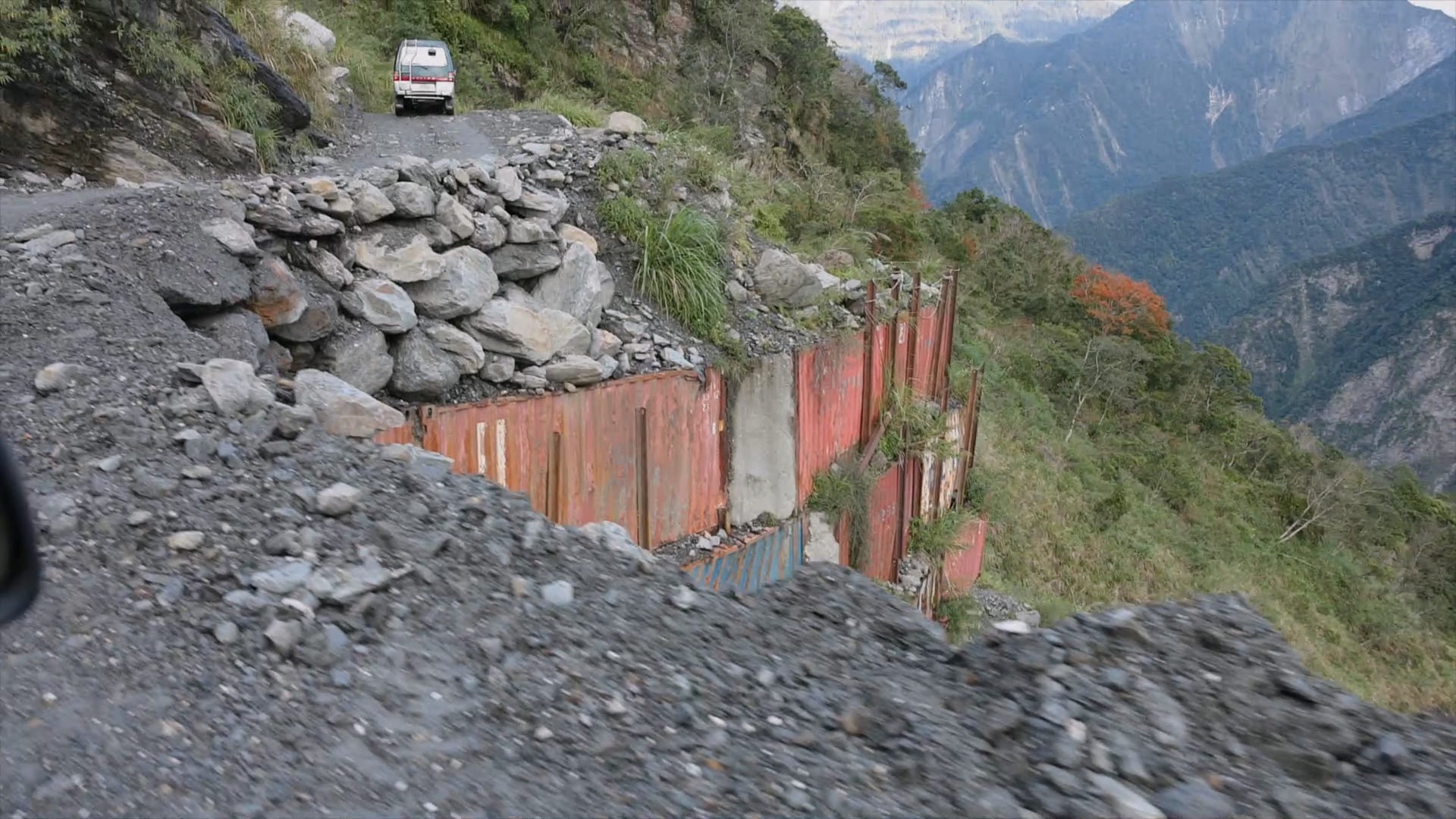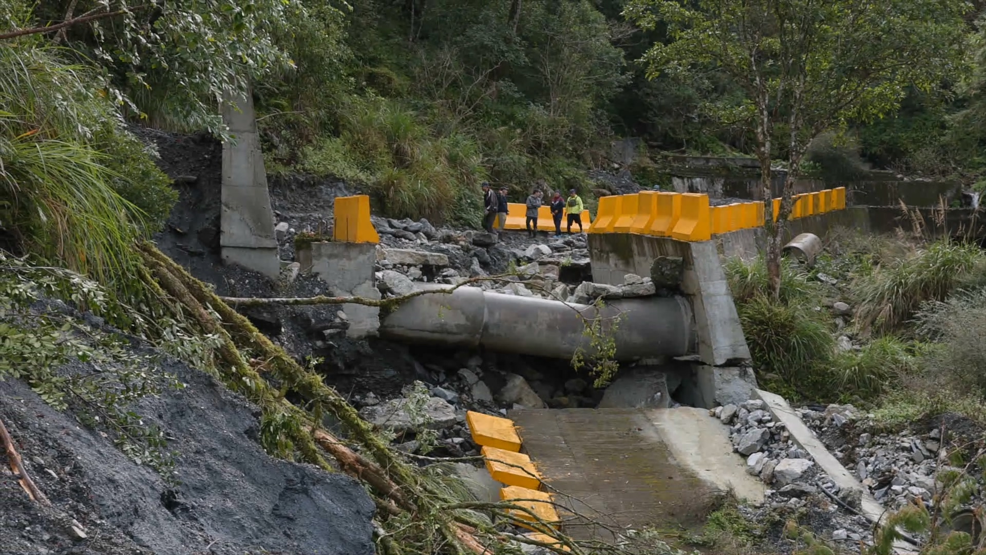 萬榮林道做為新東西輸電線的重要維護道路,台電每年投入大筆經費整修,不過自然也從未放棄收回自己的領域。在林道25公里處,才剛刷上鮮黃油漆的護欄,連著整條道路路基,滑落山谷,從這裡開始,前往堰塞湖的路,只能靠雙腳步行。