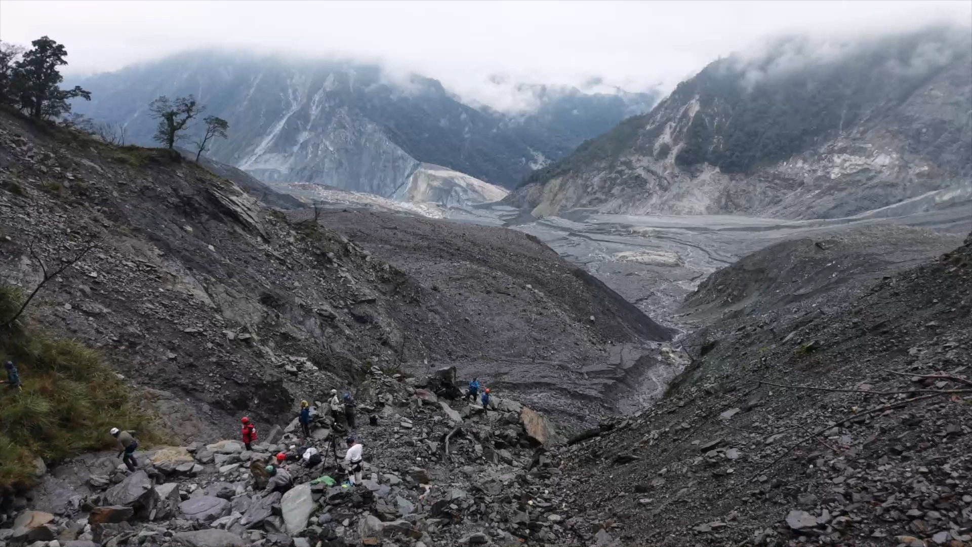 調查隊的垂降點,位於崩積平原東北側邊緣,堰塞湖位於西南側,不論是要前往湖區或大崩壁,都要跋涉過廣大的崩塌地,雖然直線距離只有一、兩公里,但水流在厚厚的崩積層上,侵蝕出大大小小的蝕溝,必須在鬆軟的土坡爬上爬下將近一個小時,才能接近適合調查的位置。