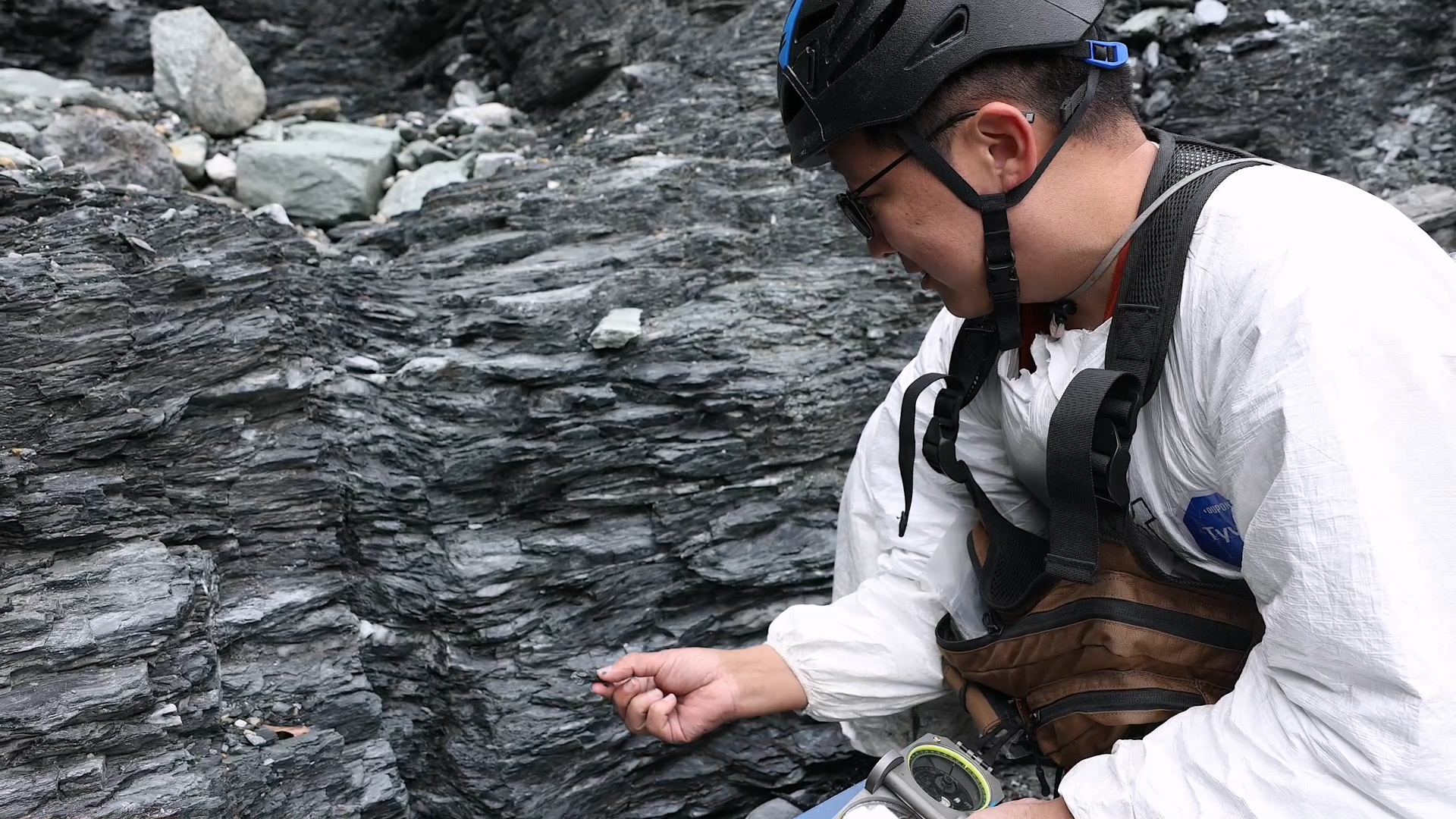 抵達崩積平原後,一部分調查隊員沿著支流往堰塞湖前進,衣德成的目標,則是西北側的大崩壁。他表示,馬太鞍溪支流不長,卻能侵蝕出大面積崩塌地,代表當地有其他容易造成崩塌的地質因素,可能是岩石的性質,也可能是斷層的活動。崩塌後岩壁大面積裸露,是地質學家進行觀察的時機。