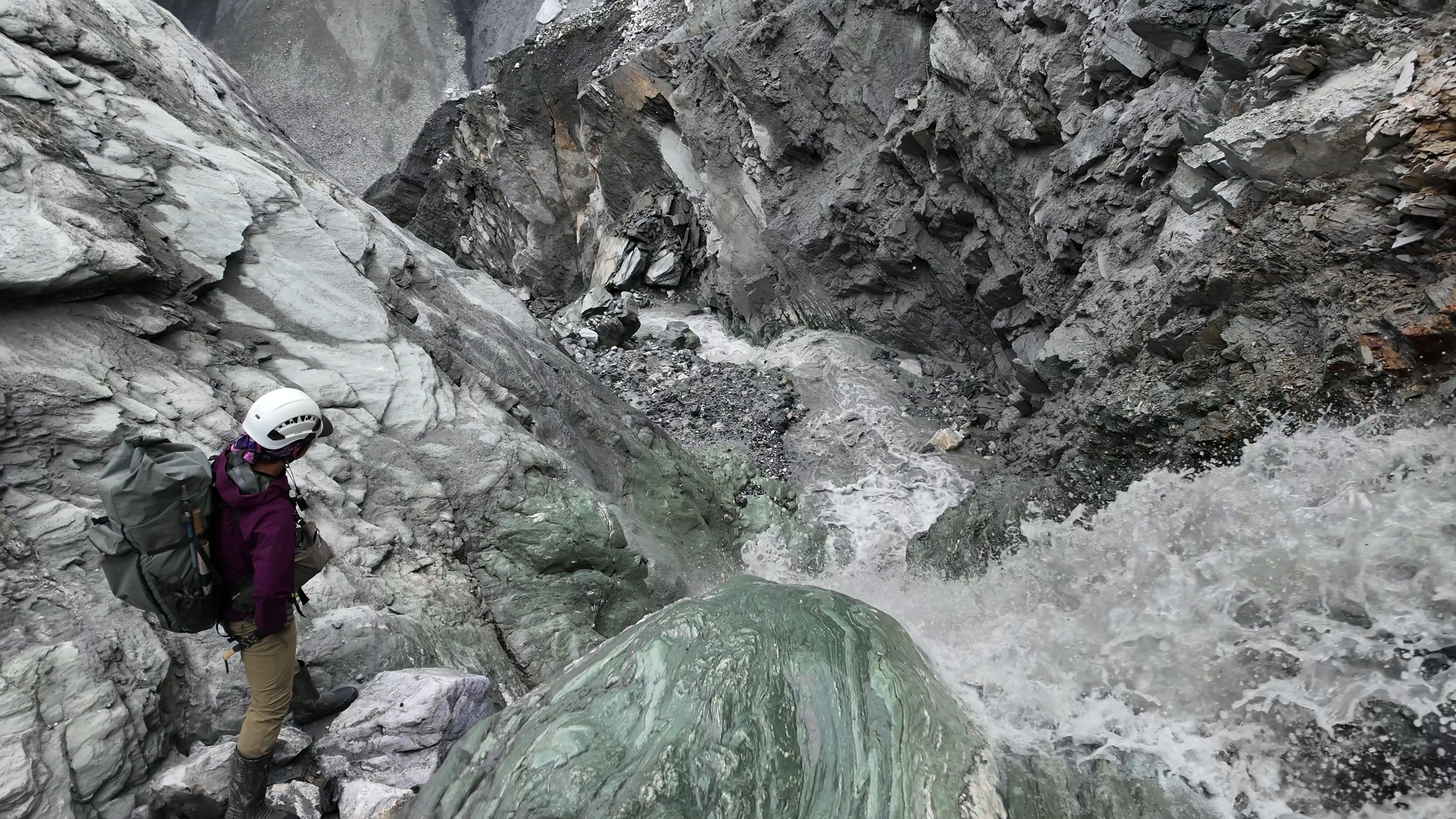 張光承回憶,特遣隊第一次探勘時,溪谷還是相對均質的陡下地形,但兩個多月後,溪流逐漸侵蝕出階梯狀的高低差。在距離堰塞湖僅剩約四十分鐘路程的位置,一座六、七公尺高的瀑布,擋住我們的去路。由於水勢湍急,對缺乏溪流垂降經驗的成員來說風險太高,考量上攀比下切更吃力,至少要花四、五個小時,才能在天黑前回到營地,我們只能在原路折返前,以空拍機紀錄堰塞湖周遭現況。
