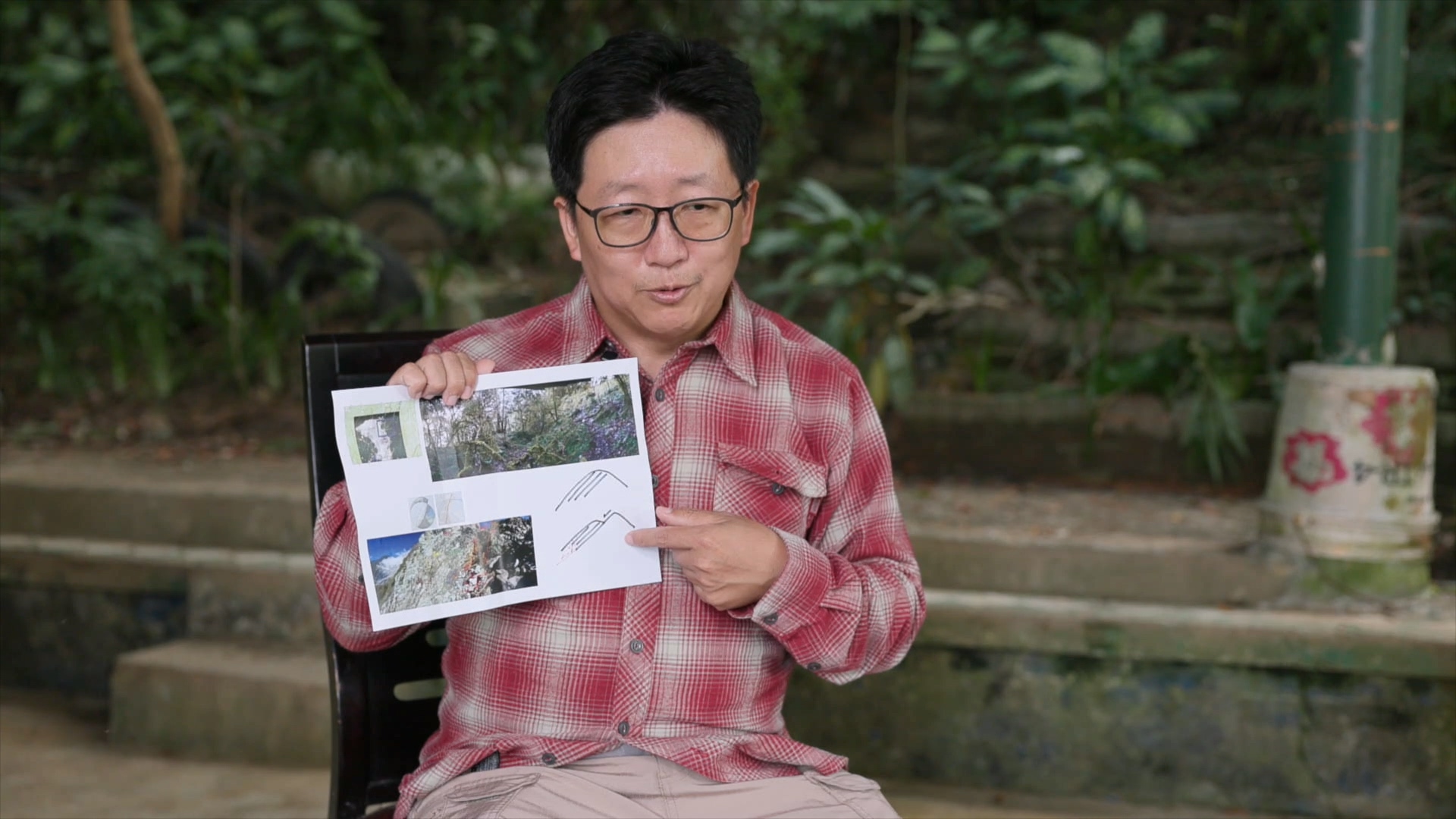 衣德成說明:「綠泥石片岩比較破碎,雨水入滲後沿著破碎帶流動,這個地下水通道就會是一個氧化帶。」這就是為何我們會在岩壁上看到紅褐色痕跡的原因。