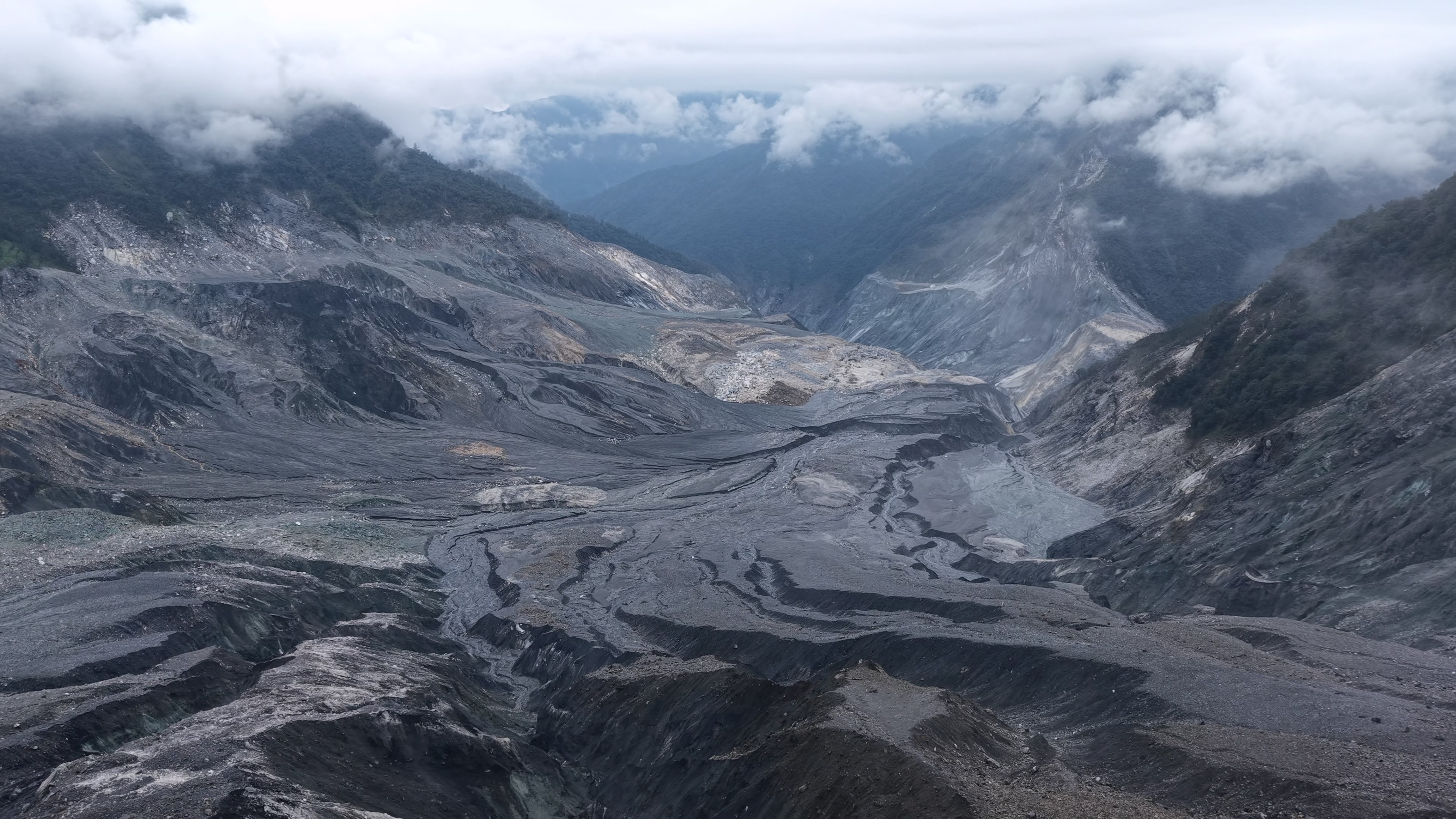 2025年12月中旬,堰塞湖蓄水量約30萬噸,僅剩潰壩前9100萬噸的0.28%左右,當時淹沒在水線之下死亡的樹木呈現枯黃的顏色,標示出原先的水位,湖水持續從溢流口流出,切割出壯觀的V型峽谷。