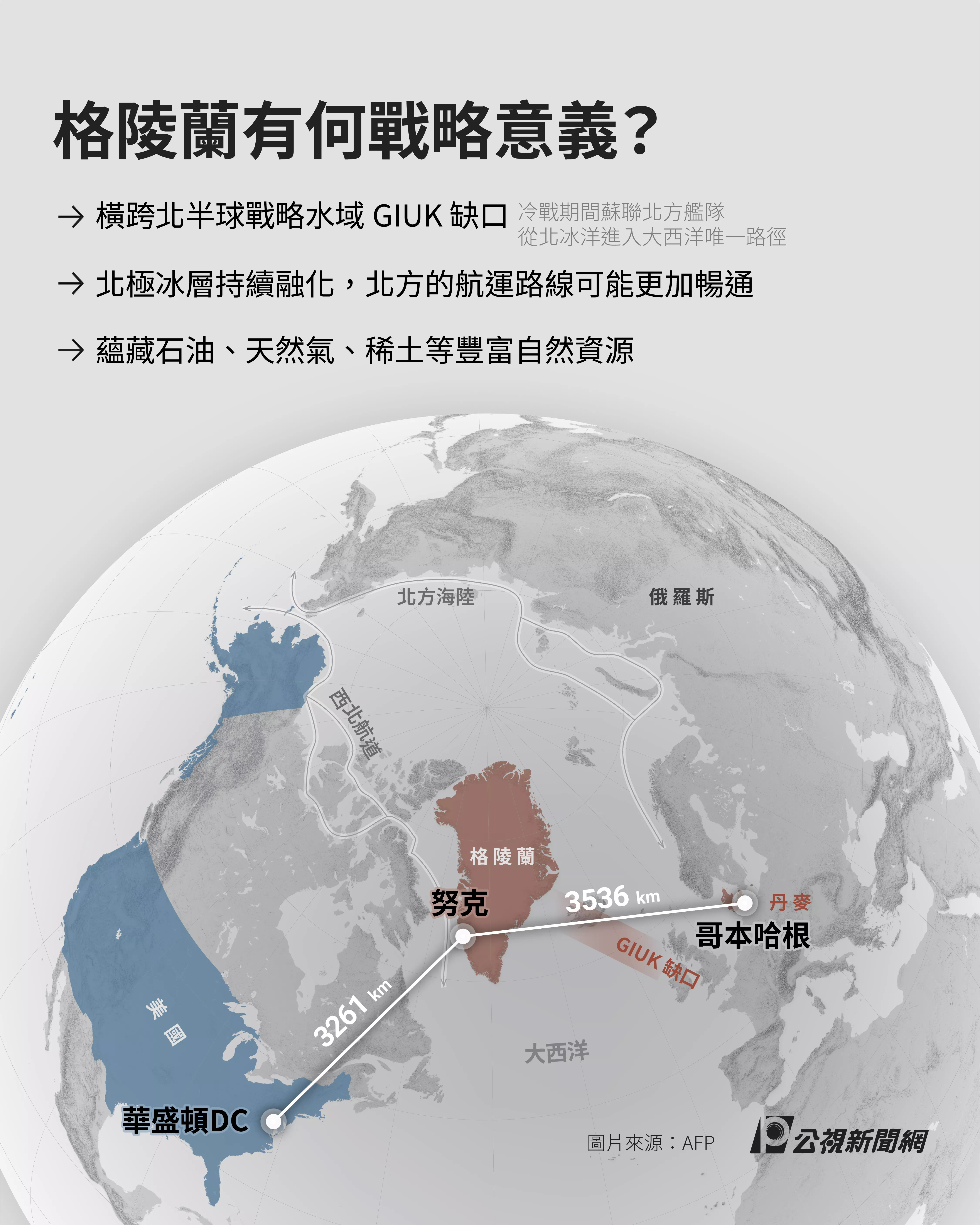 格陵蘭位於北冰洋與大西洋間,面積約216萬平方公里,是全球最大的非大陸島嶼,雖然全島有8成均被冰雪覆蓋,但由於位置串聯美國、歐洲、俄羅斯,且橫跨北半球戰略水域「GIUK 缺口」(冷戰期間蘇聯北方艦隊從北冰洋進入大西洋唯一路徑),因此一直被美國視為國安關鍵。