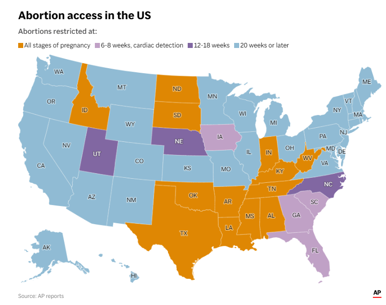 目前美國有13個州完全禁止墮胎,另有4個州僅允許孕婦在受孕6-8周內墮胎、3個州可在12-18周內墮胎,其他州分別以不同規範限制。