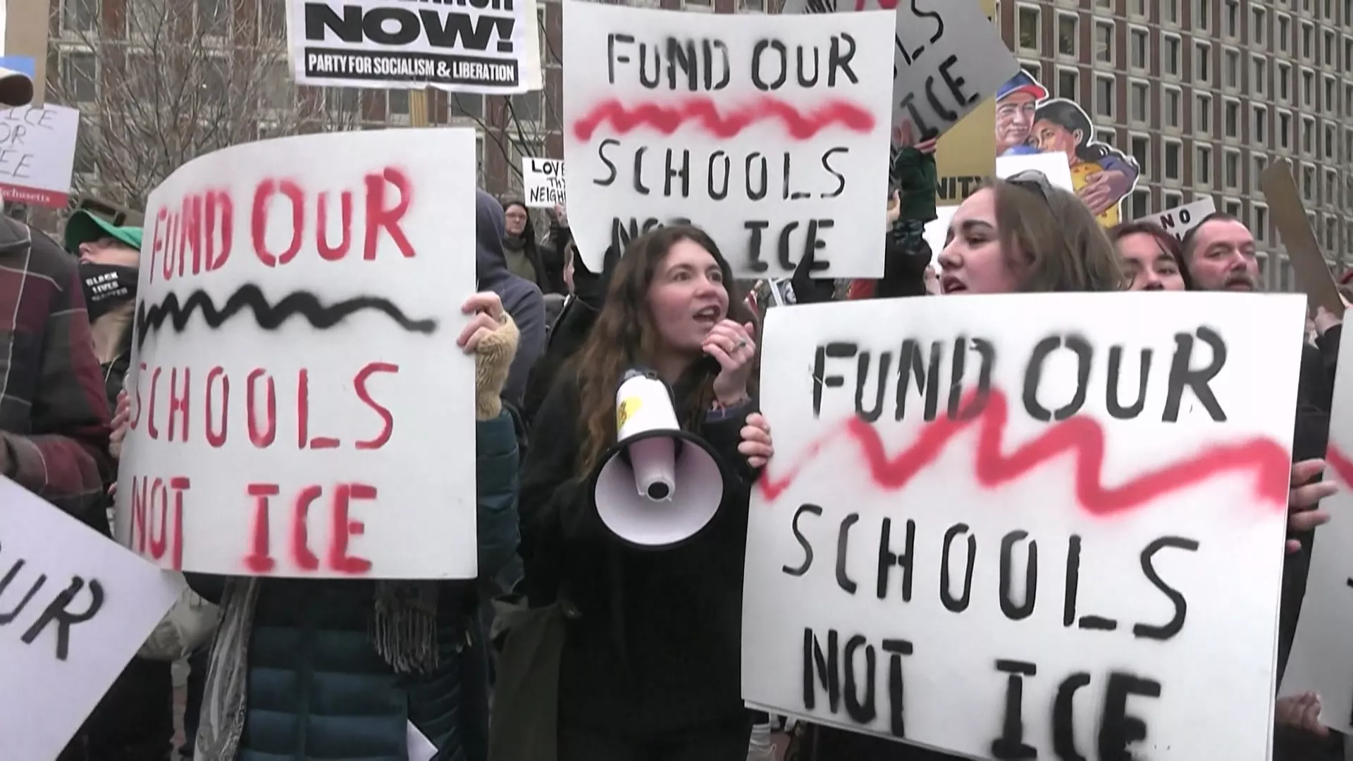 明尼阿波利斯市中心大馬路,10號零下6至8度酷寒的天候下,聚集了成千上萬的示威者,高舉各式標語,並大聲呼喊要「移民暨海關執法局ICE滾出當地」。