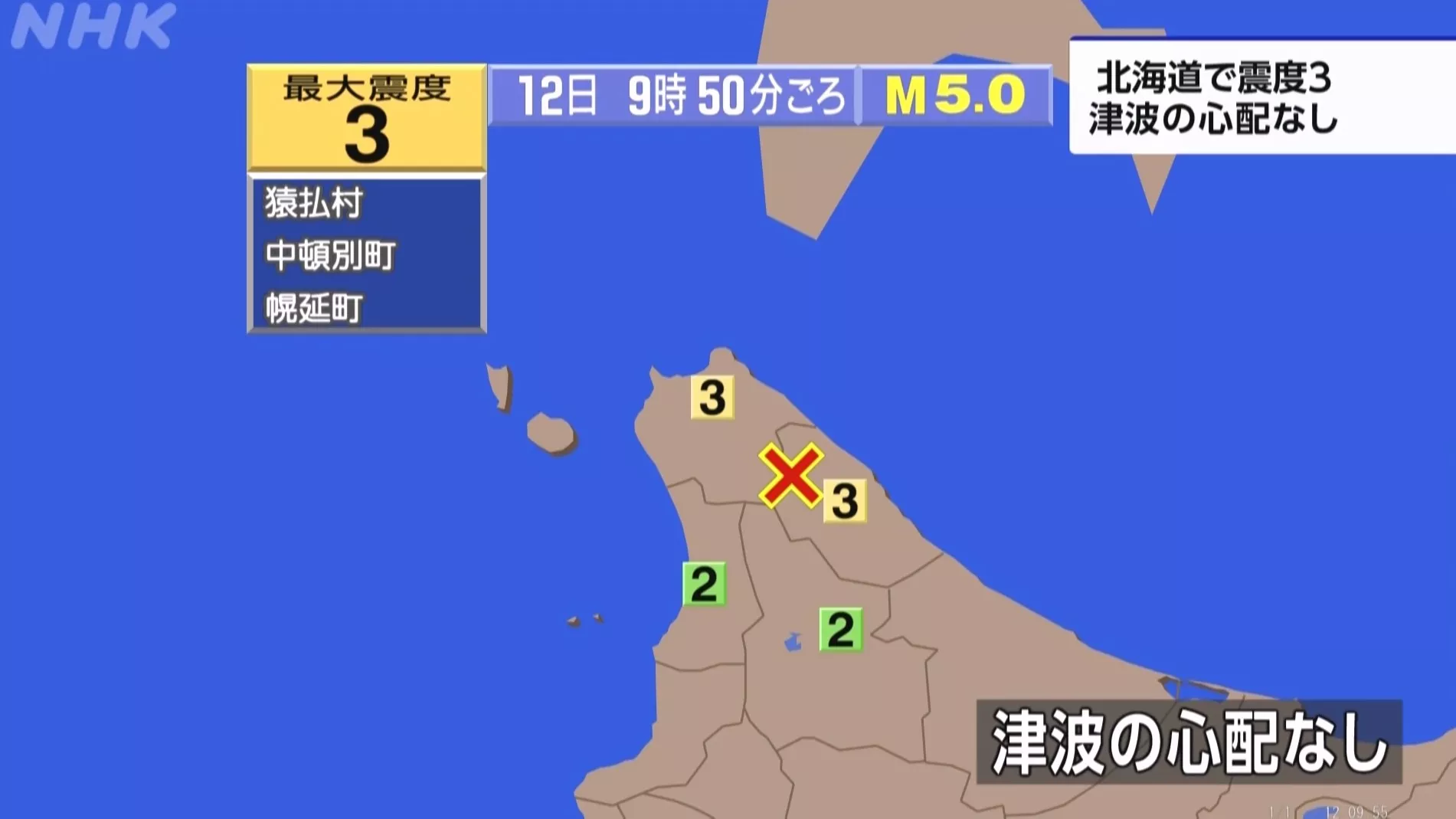 位在日本北海道西北角的宗谷地區,今(12)日發生芮氏規模5.0的地震,但是並沒有觸發海嘯警報。