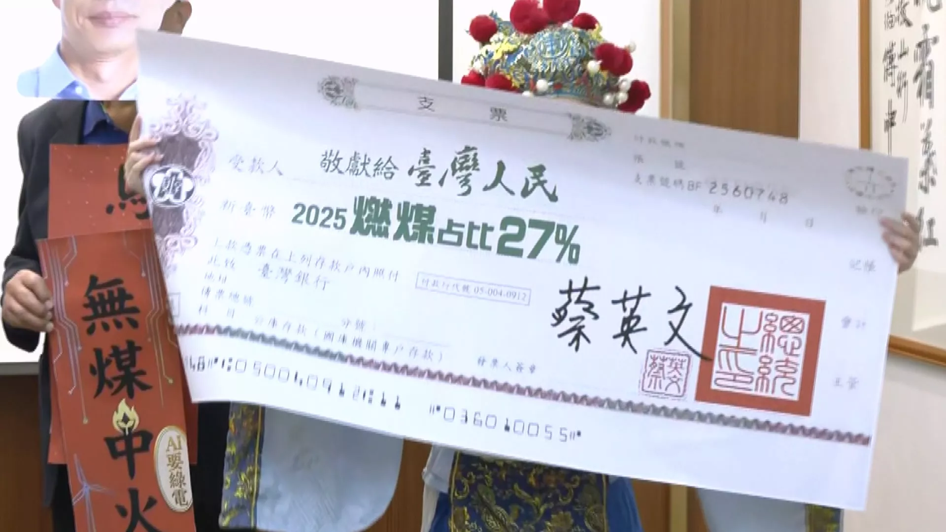 環團代表扮演總統賴清德、行政院長卓榮泰演出行動劇,更拿出前總統蔡英文2021年開出、讓燃煤占比在2025年降至27%的支票,呼籲執政黨落實。