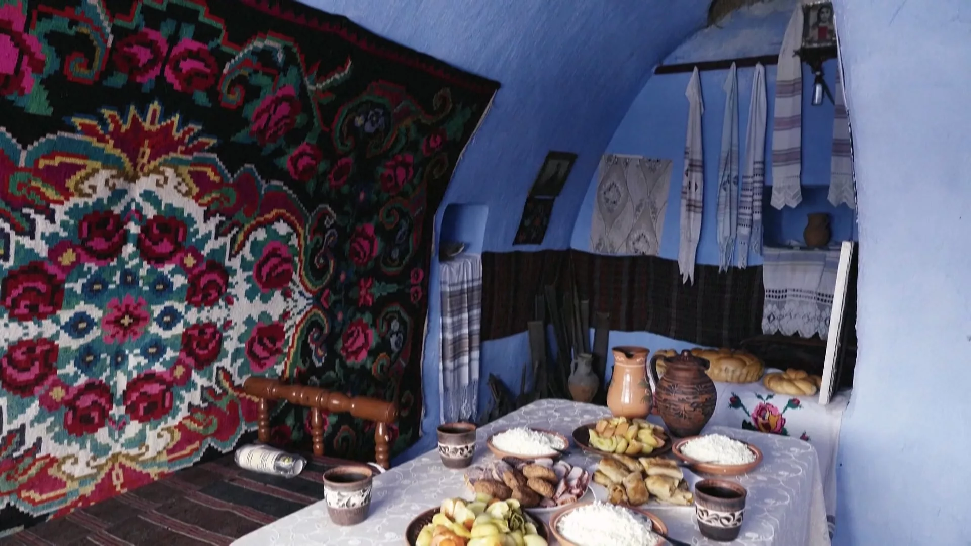 為了對抗夏天酷熱、冬季嚴寒的氣候挑戰,老祖宗設計出從草坡挖進去的矮石屋,小圓拱型入口必需彎腰才能進入,彷彿電影魔戒中哈比人的住所。2020年一棟修復完成的地穴屋正式對外開放,成為博物館,藍色牆面掛著手工刺繡地毯,餐桌上能看到玉米粥、羊奶起司、醃菜與紅酒等傳統美食。