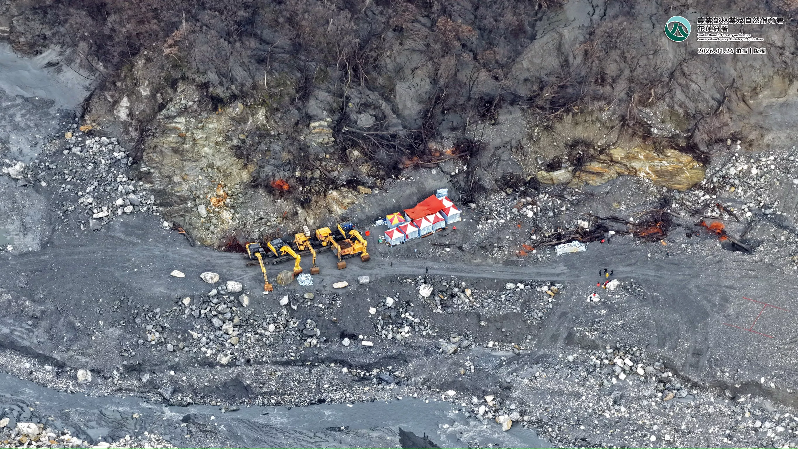 林保署花蓮分署表示,為降低馬太鞍溪堰塞湖溢滿潰決後殘餘水體風險,自去(2025)年12月起,即由燕子口堰塞湖降挖工程團隊冒險沿著馬太鞍溪河道挺進壩區,展開降挖作業。施工過程除面臨道路中斷、體力與糧食耗盡、低溫與天候不穩等難題外,還須克服落石掩埋人員機具、以及土石崩落阻斷物資運補路線等問題,最終才請求空勤直升機協助救援。