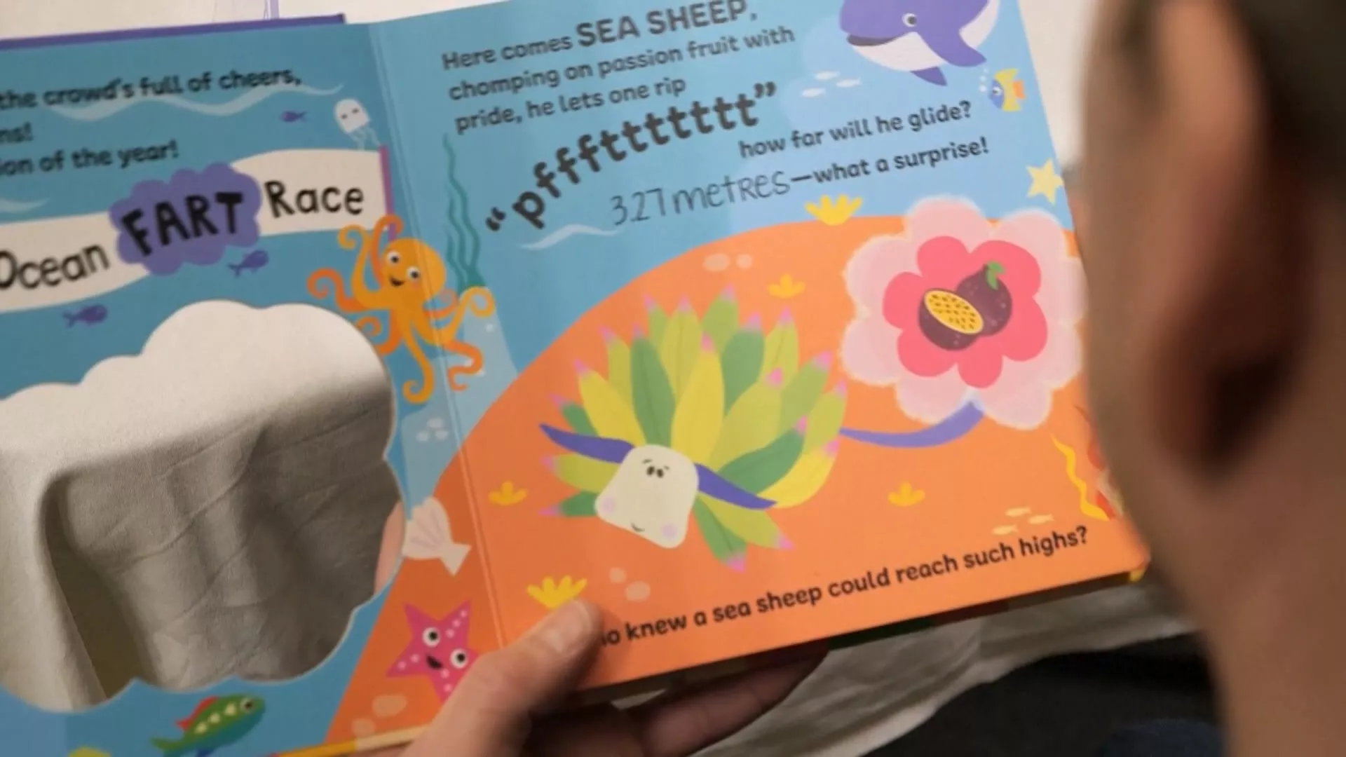 大頑童玩具趨勢中,廁所黑色幽默是另一股銷售風潮。像這個屁股臉玩偶還有小狗撒尿,都獲選為2026年英雄玩具名單;還有這本互動書《海底放屁書》,刮一刮圖案就能聞到味道。