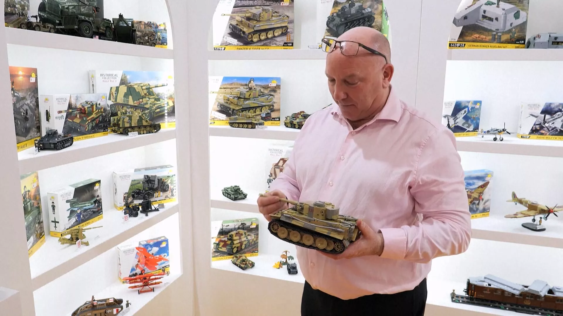 波蘭模型品牌Cobi陳列直升機、戰鬥機和戰艦模型瞄準的買家,就是專門收藏軍事品的大頑童。這款二戰德國虎式坦克比例模型,售價約為台幣3萬3000元,買家DIY組裝之後就是完美的擺飾。這群玩家對懷舊的熱愛與強大的購買力,為玩具產業注入了強心針。