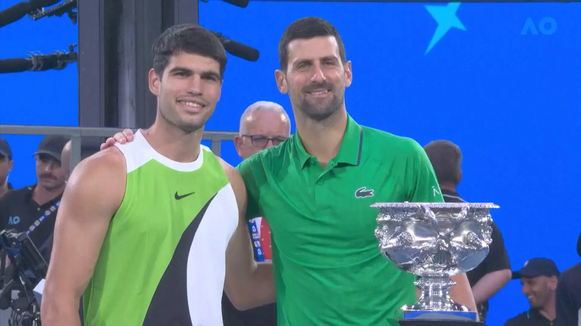 西班牙的艾卡拉茲對上塞爾維亞的喬科維奇,前後球王在澳洲網球公開賽男單最終大對決。第一盤喬科維奇一發成功率與得分率都很高,沒有給艾卡拉茲太多機會以6比2先拿下,接著第二盤喬科發球狀態下滑,艾卡拉茲兩度成功破發加壓並且積極進攻,鏡頭下方的喬科維奇來到網前,反拍截擊再次接招掛網。艾卡拉茲6比2扳回一城,喬科維奇這一盤的發球得分率從首盤93%掉到58%。接著雙方戰力更加緊張,鏡頭上方的艾卡拉茲這個反拍回擊打出大角度,喬科維奇疲於奔命,艾卡拉茲再度打出精采好球。