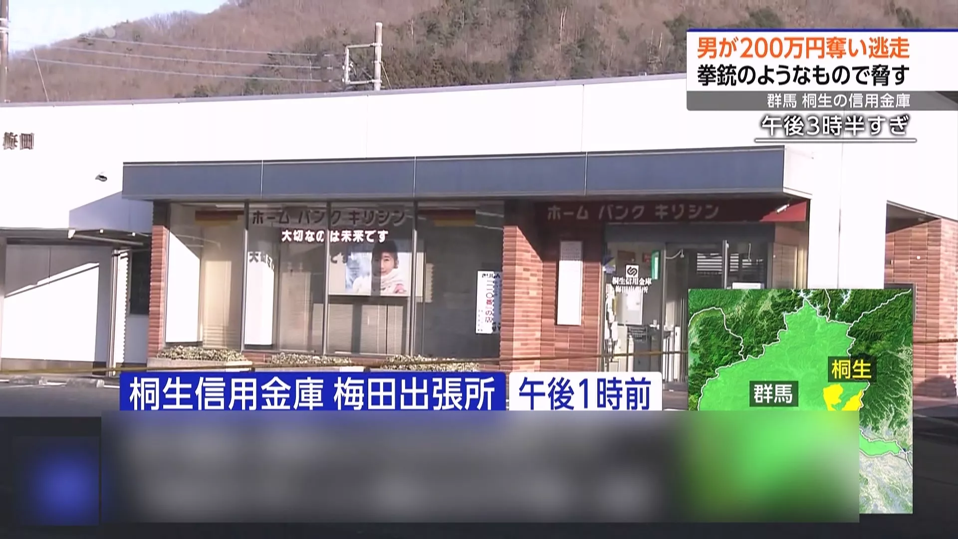2日下午的搶案,是發生在當地下午1時左右,群馬縣桐生市的桐生信用金庫梅田分行,遭到一名歹徒持槍搶劫逃逸,歹徒逃跑前,還留下一個疑似裝有爆裂物的盒子,嚇得行員在嫌犯逃跑後,通知員警到現場進行拆除,所幸只是虛驚一場。
